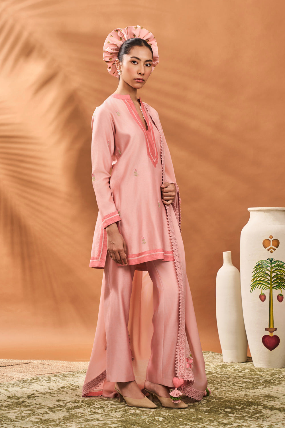 KURTA -Short kurta adorned with beautiful resham and poth embroidery | Mandarin Collar and Sleeves embelliahed with dark tone fabric border