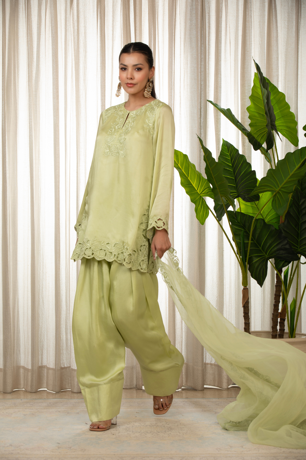 It consists of Bemberg pure satin kurta distinguished by it delicate cutwork embroidery. It is paired with organza cutwork dupatta and complimentary salwaar.