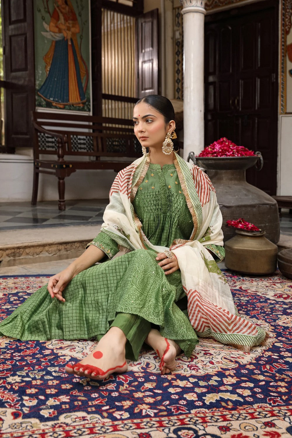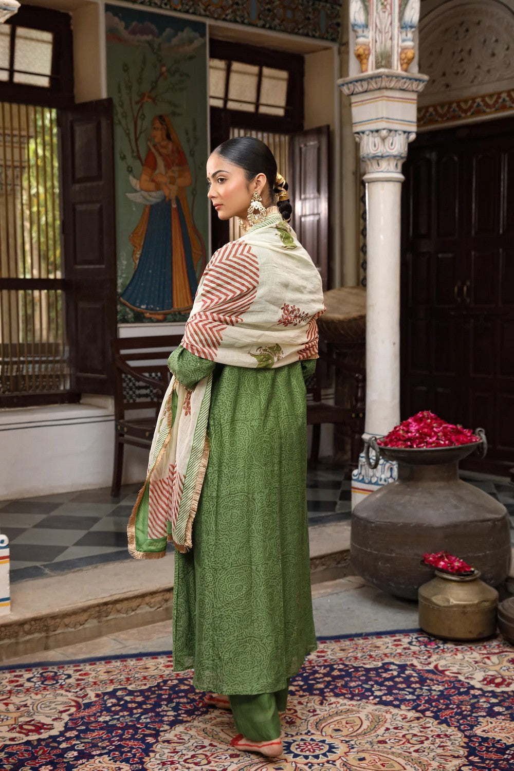 Make a statement with our Pocket Detail Printed Silk Chanderi Kurta Set, crafted from exquisite hand block-printed silk Chanderi and lined with soft cotton for a relaxed fit. This luxurious three-piece ensemble features a green kurta adorned with intricate zardosi embroidery, complemented by functional pockets for added style and convenience. Designed with a classic mandarin collar and a front button-down closure, the kurta pairs beautifully with tailored pants. The set is completed with a stunning Pichwai hand block-printed dupatta, adding an artistic touch to this elegant outfit.