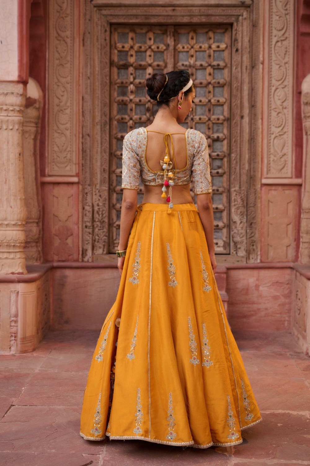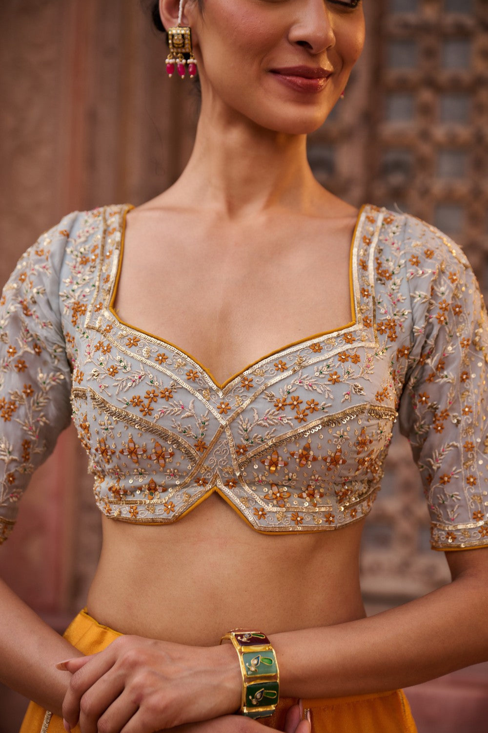 Mustard and Powder blue embroidered blouse, lehenga and dupatta