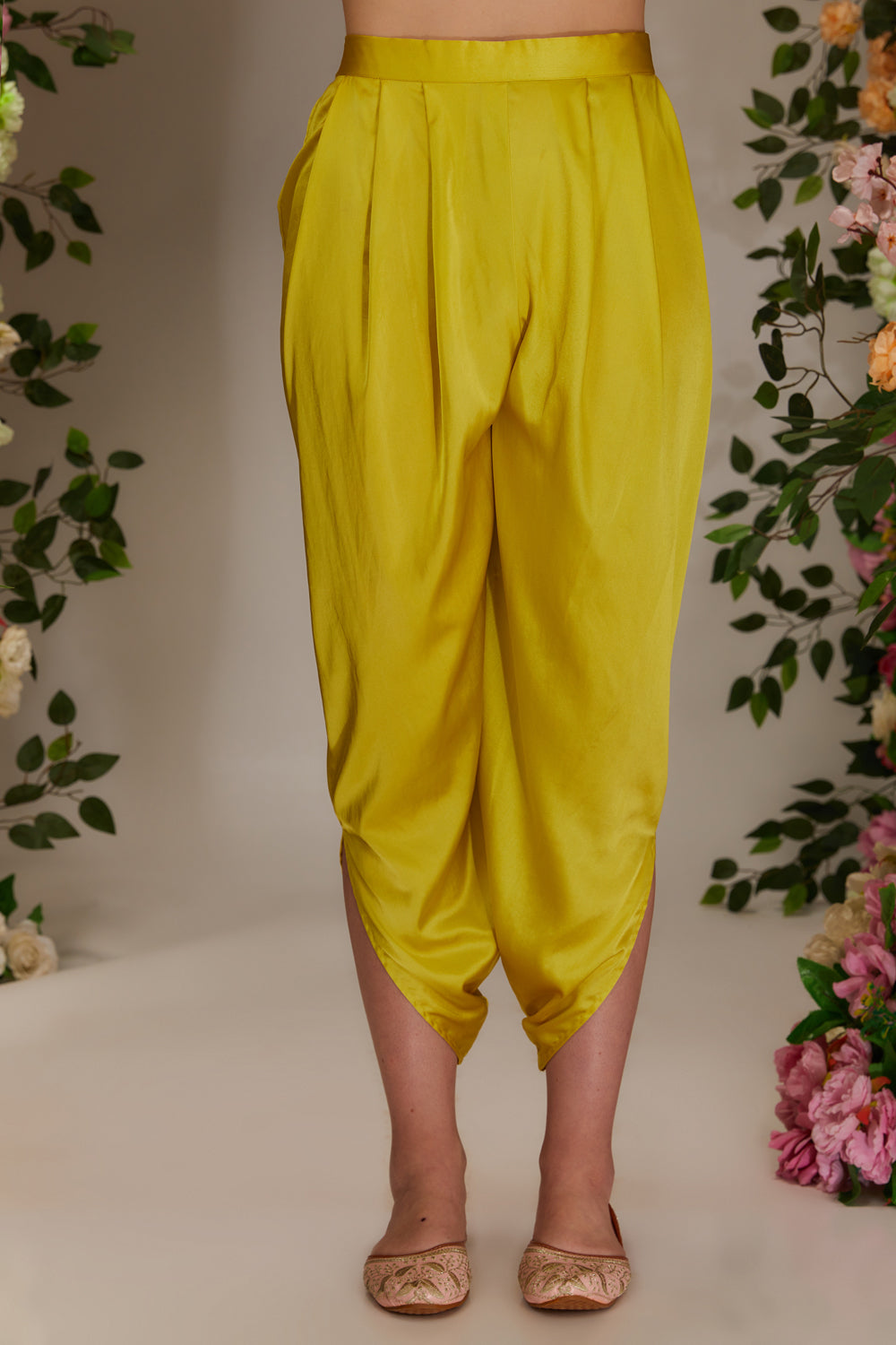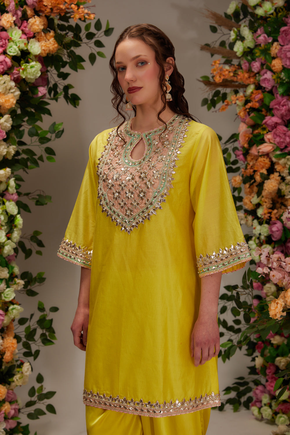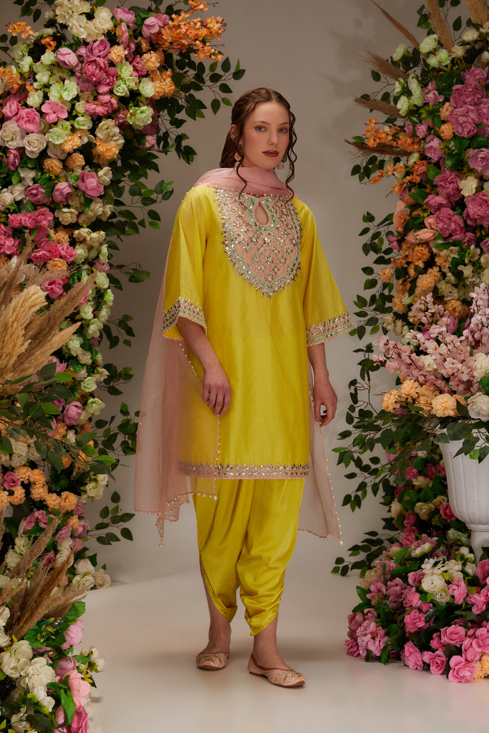 Introducing the "x" collection: a chic yellow chanderi short a-line kurta set paired with stylish samosa pants and an ethereal organza dupatta. handcrafted with intricate shimmering sequins and moti, this ensemble exudes timeless elegance and charm, perfect for special occasions.