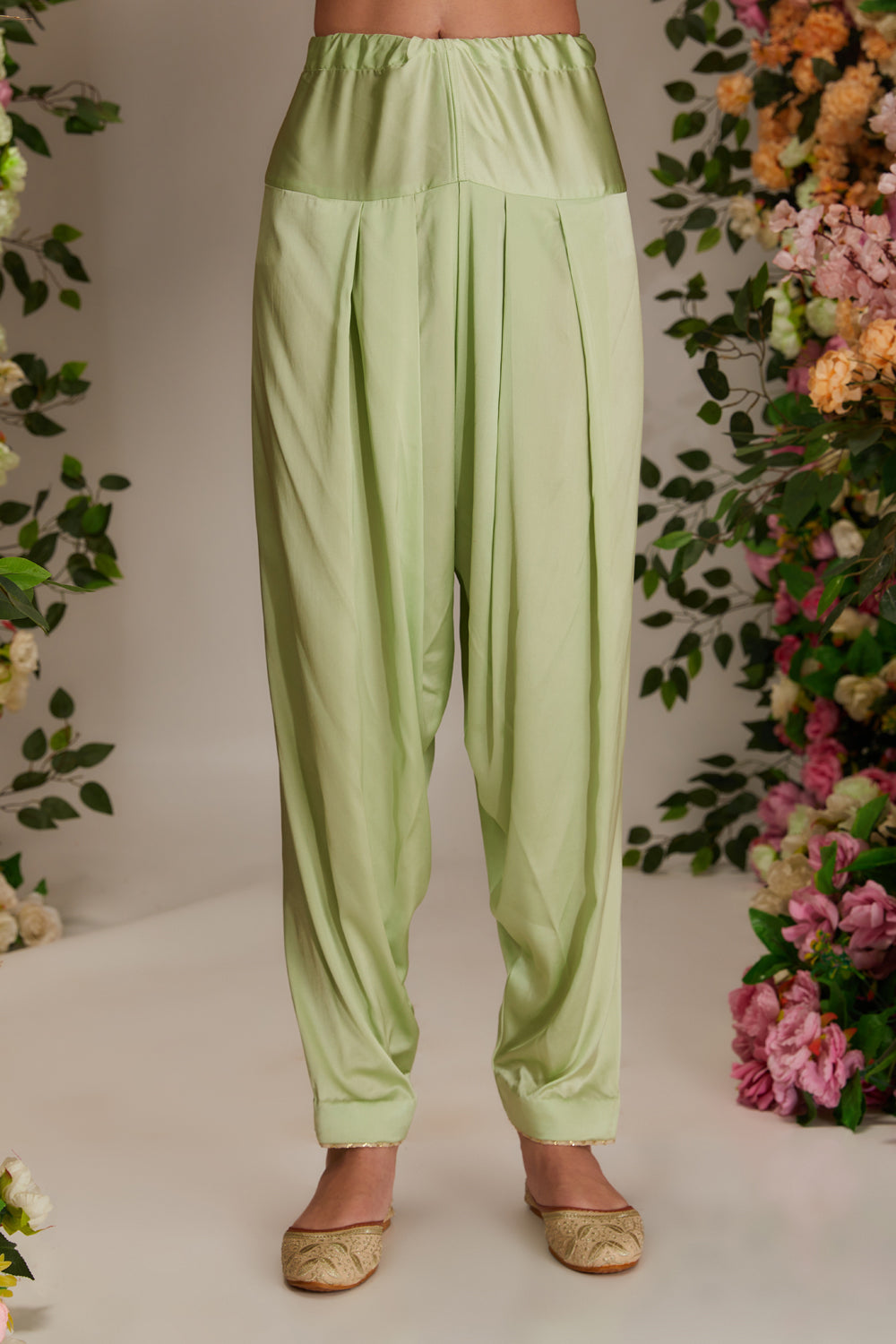 Introducing the "x" collection: a pista green chanderi a-line kurta set paired with salwar and an ethereal organza dupatta. handcrafted with intricate gota work, shimmering sequins and moti, this ensemble exudes timeless elegance and charm, perfect for special occasions.