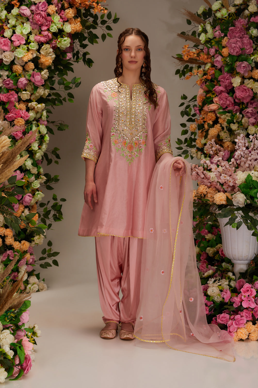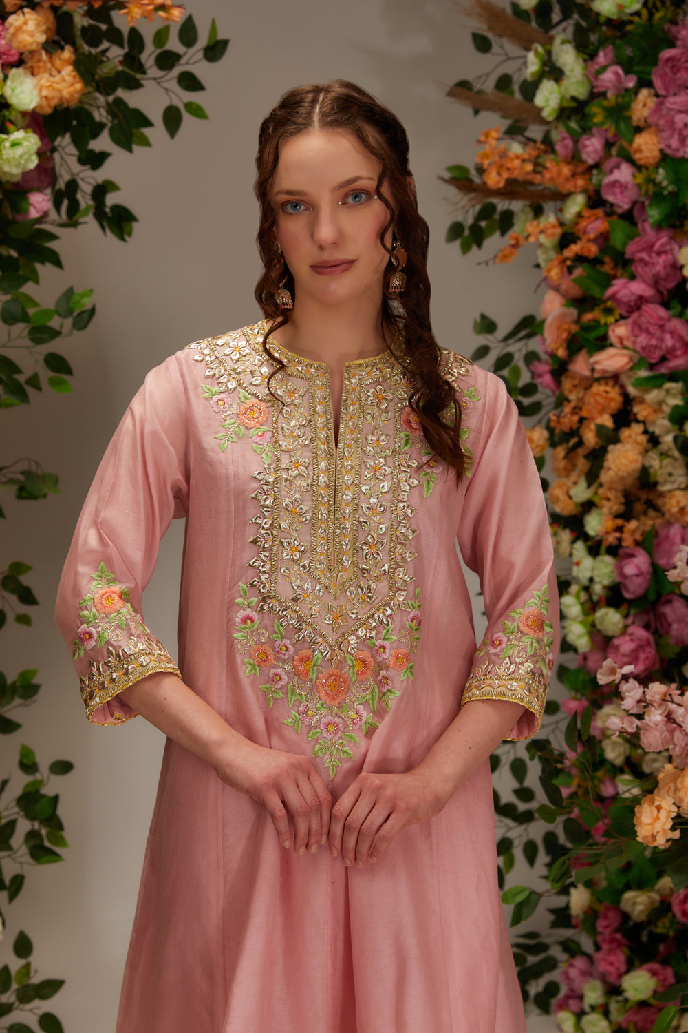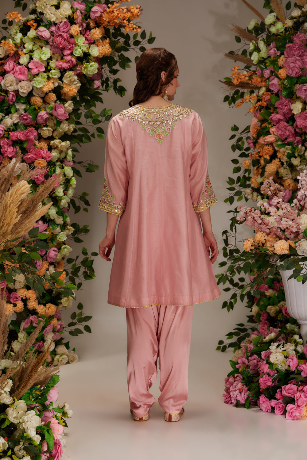 Introducing the "x" collection: a pink chanderi short anarkali kurta set paired with salwar and an ethereal organza dupatta. handcrafted with intricate gota work and resham , this ensemble exudes timeless elegance and charm, perfect for special occasions.