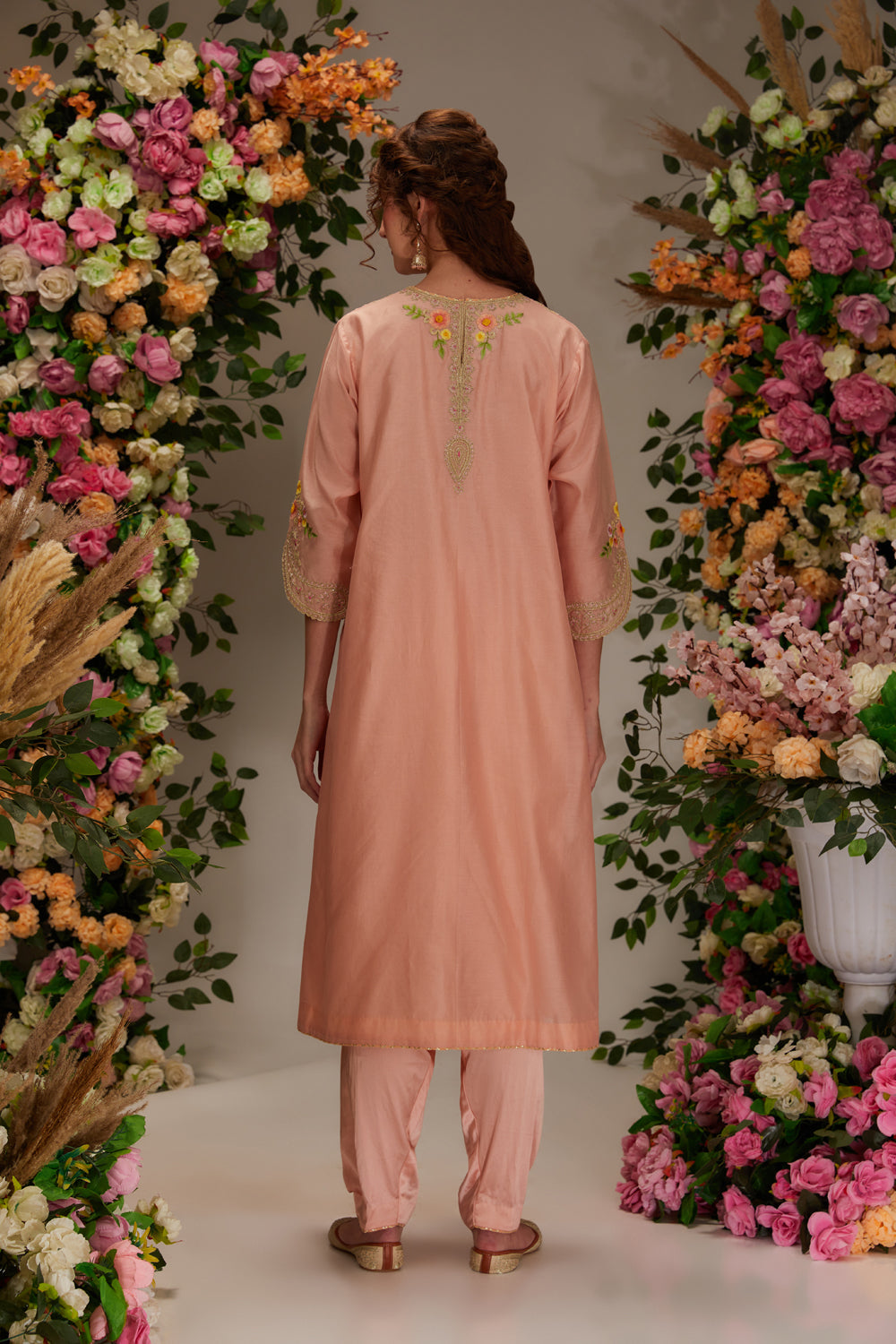 Introducing the "x " collection: a peach a-line kurta set paired with a dupatta and salwar. inspired by festive hues handcrafted with intricate embroidery, for a look that exudes elegance and charm.