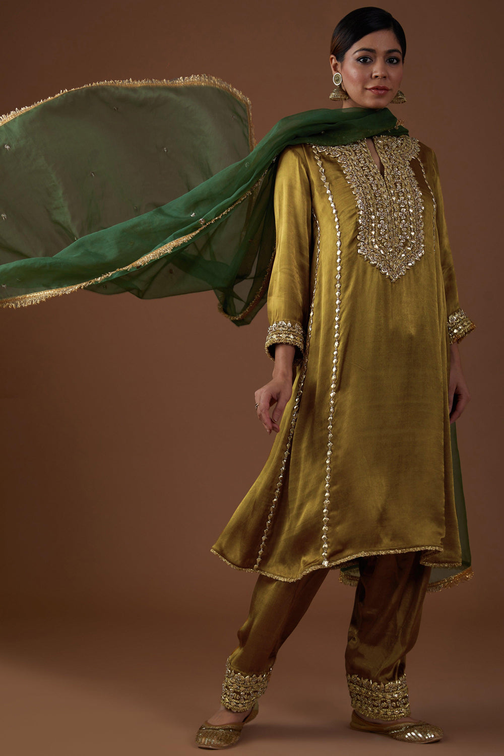 Crafted from luxurious champagne gold mashru silk, this exquisite kurta and salwar ensemble is adorned with meticulous hand embroidery. the embellishments, including delicate gota, sparkling sequins, lustrous pearls, and intricate nakshi work, elevate its allure. complementing this opulent attire is a enchanted sage organza dupatta, exuding timeless elegance.