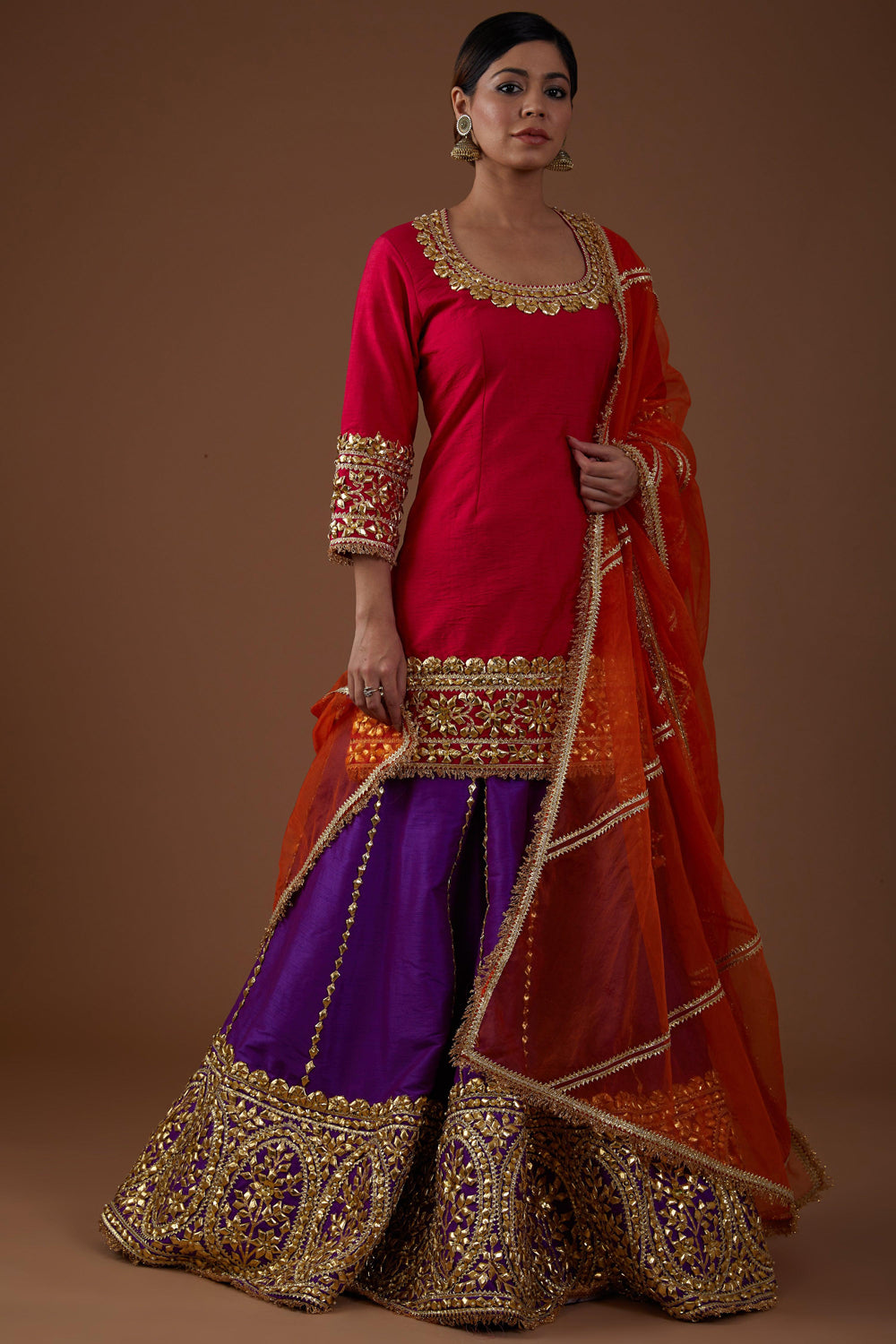 Crafted from luxurious vivid berry hued dupion silk kurta-adorned with rich-violet lehenga ensemble is adorned with meticulous hand embroidery. the embellishments, including delicate gota, sparkling sequins, lustrous pearls intricate work, elevate its allure. complementing this opulent attire is a burnt amber hued organza dupatta, exuding timeless elegance.
