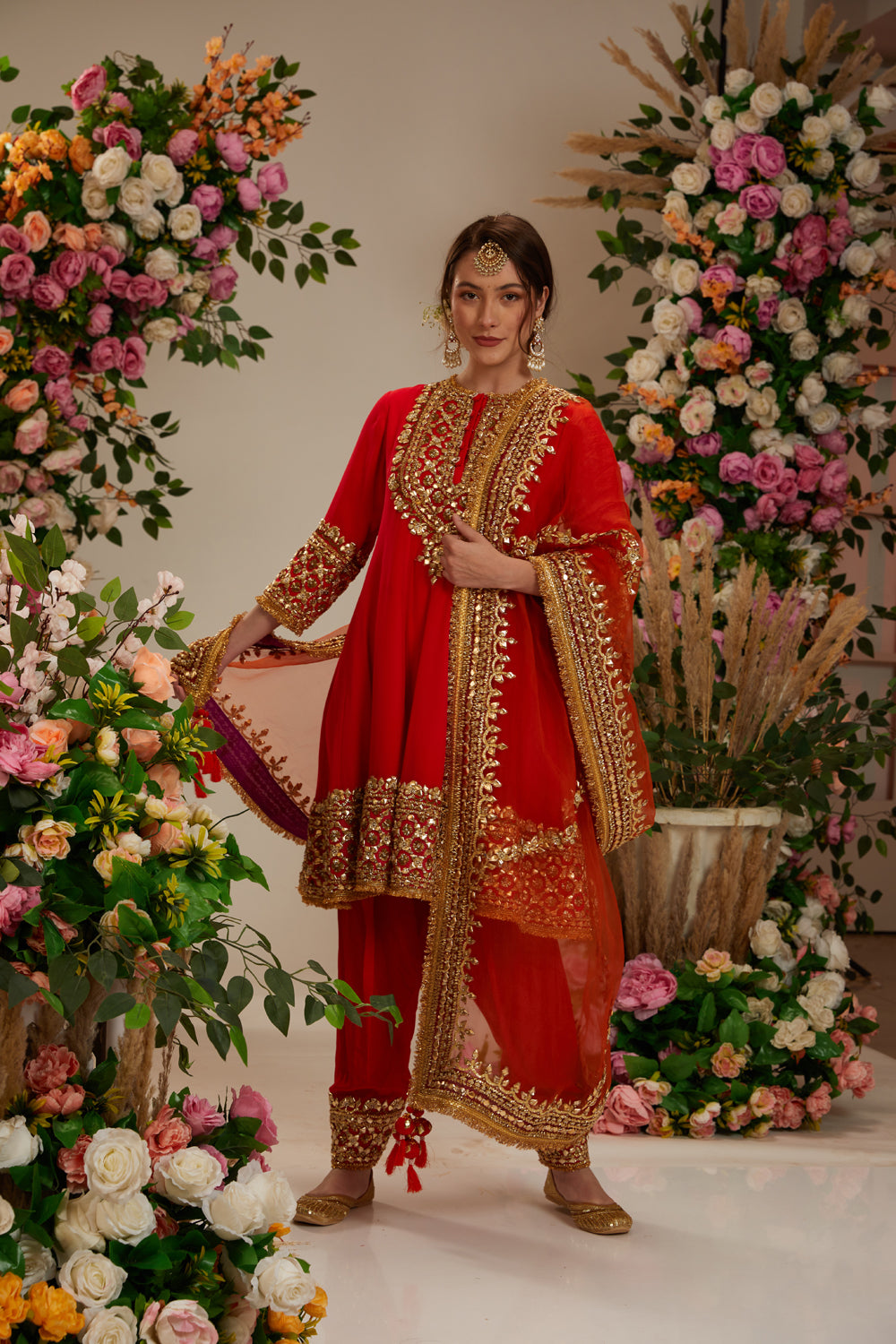 Fuchsia anarkali, embellished with intricate gota work, exuding timeless charm. paired with a classic salwar, and complemented by an organza dupatta featuring a delicate gota border