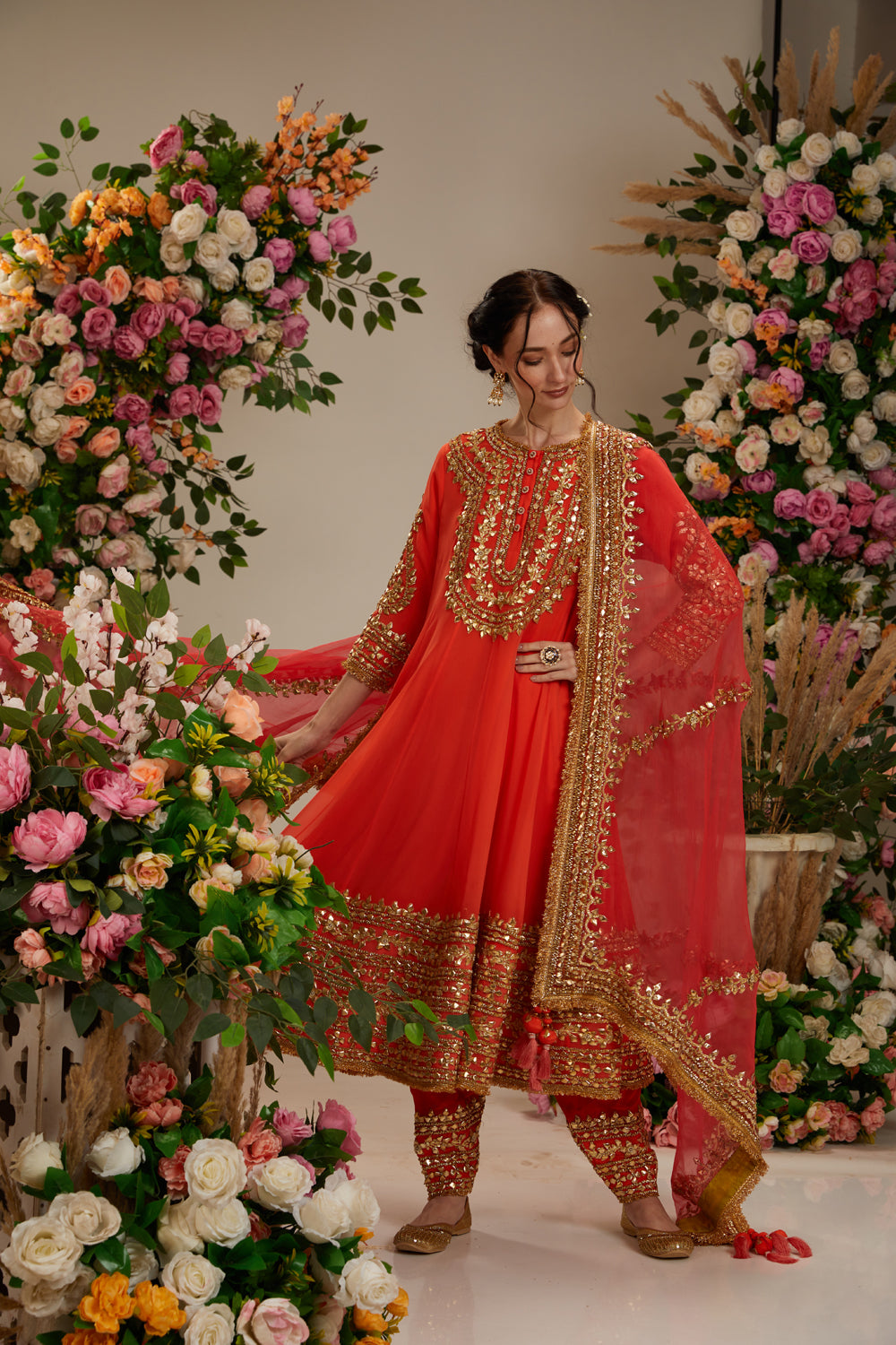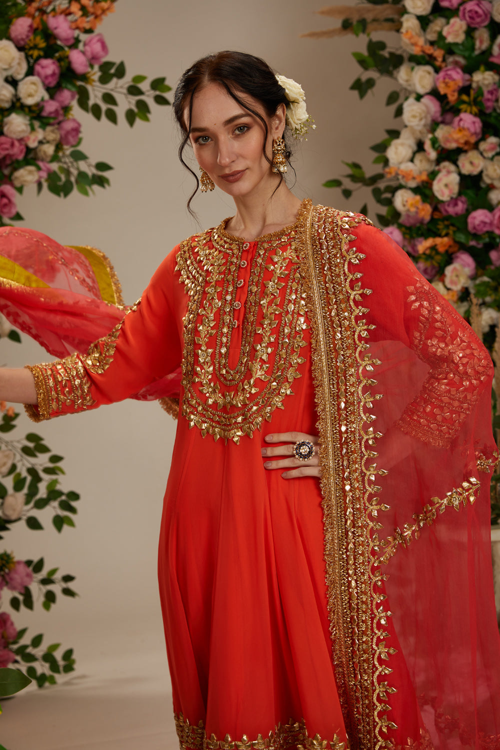 Coral orange anarkali features intricate handmade gota work with matching salwar and pure organza dupatta