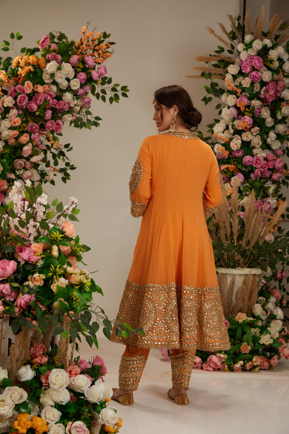 Peach Orange Long Anarkali With Matching Salwar With Organza Dupatta