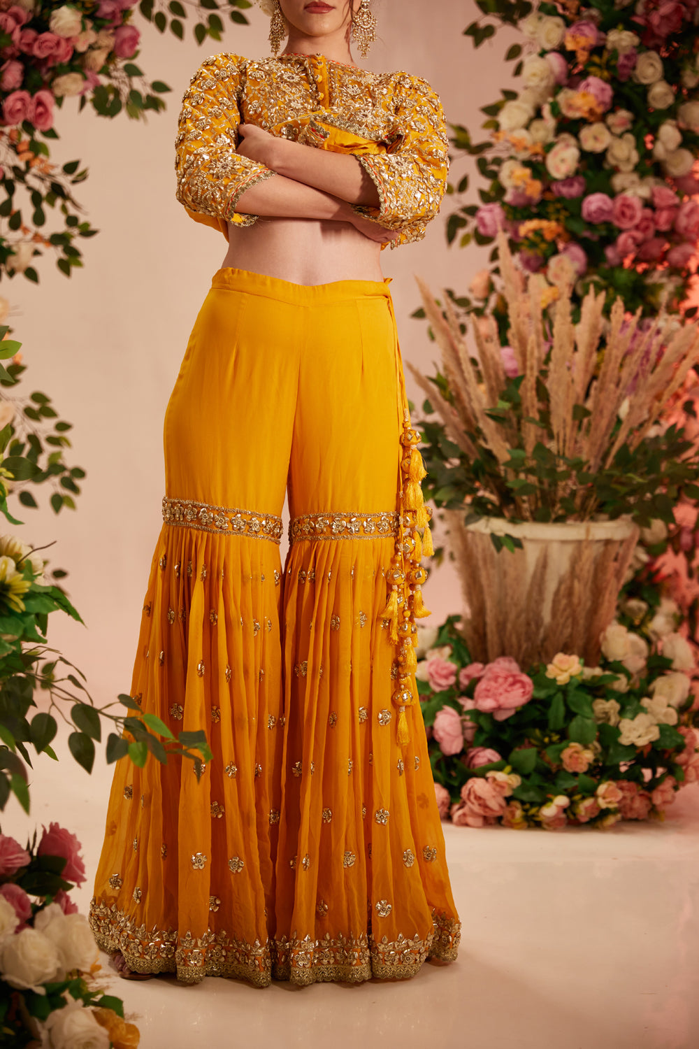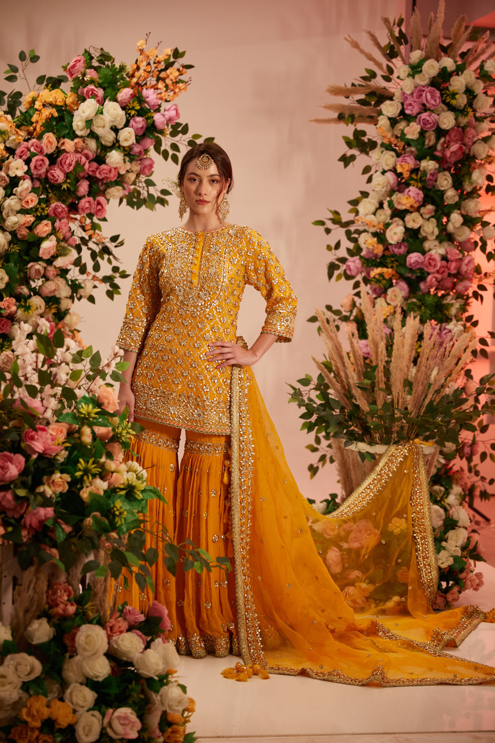 Yellow short kurta embellished with gota work paired with garara adorned with delicate gota detailing and georgette dupatta