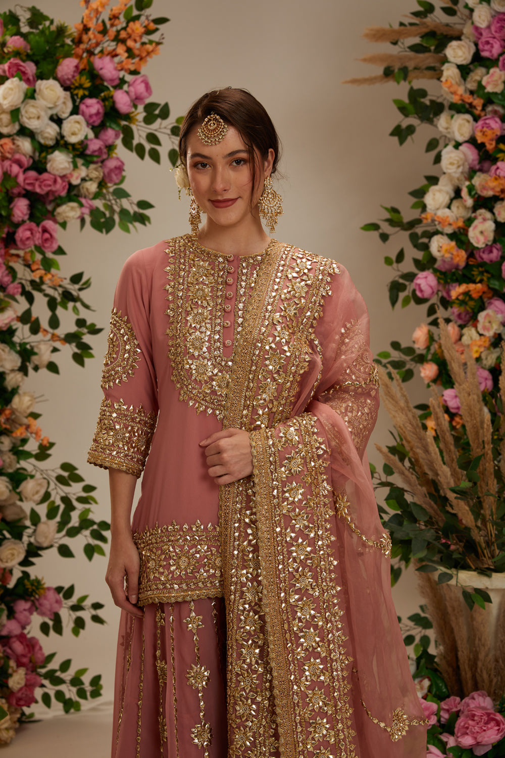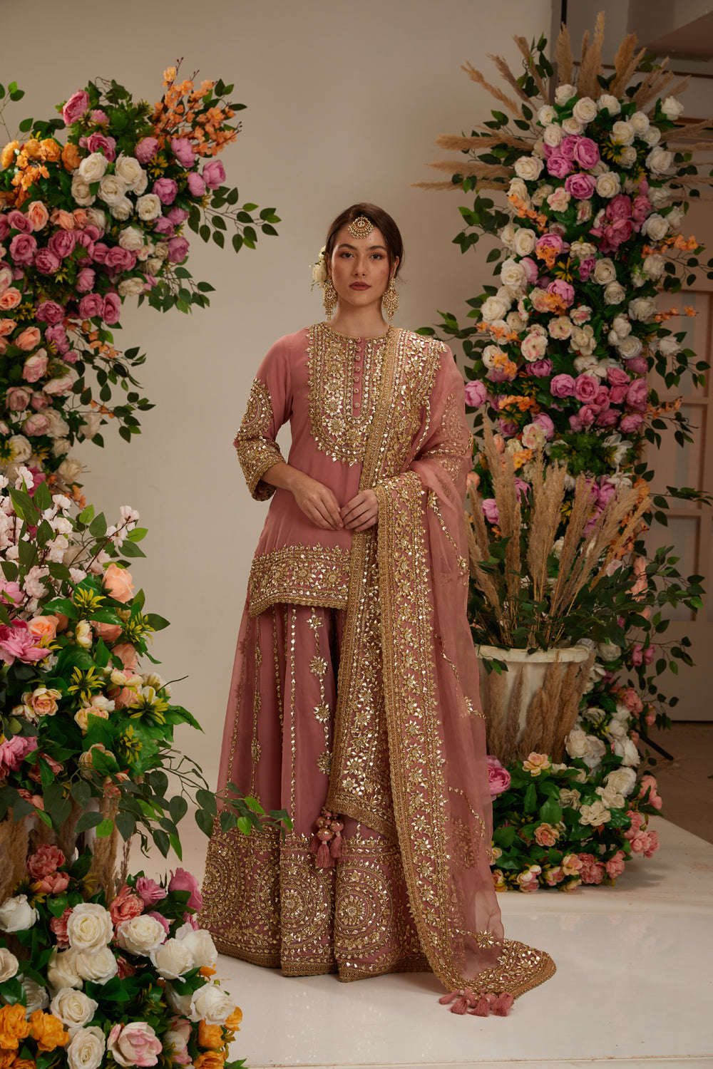 Mauve georgette kurta with gota work paired with a stunning sharara adorned with matching gota work and a delicate net organza dupatta that also features intricate gota detailing