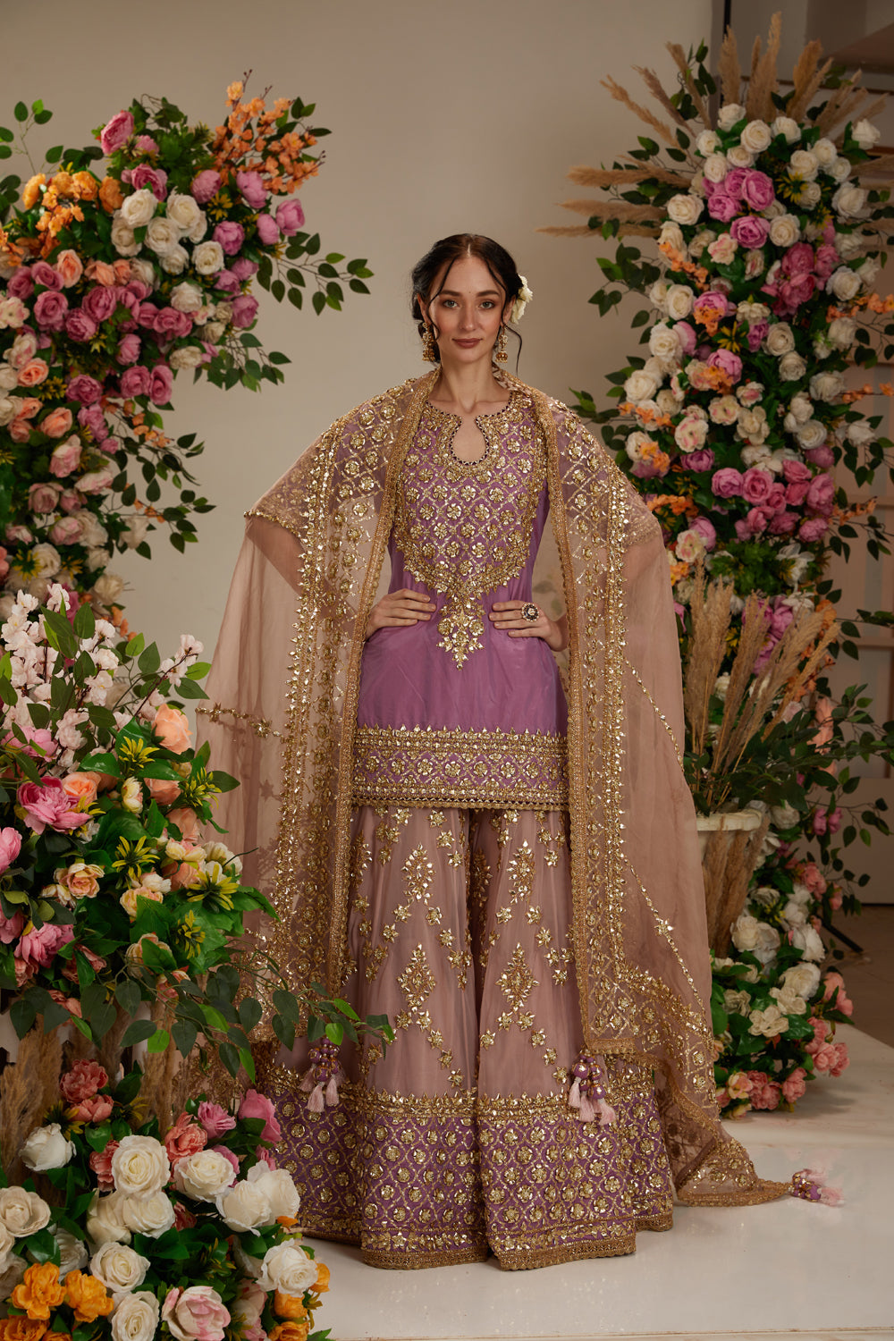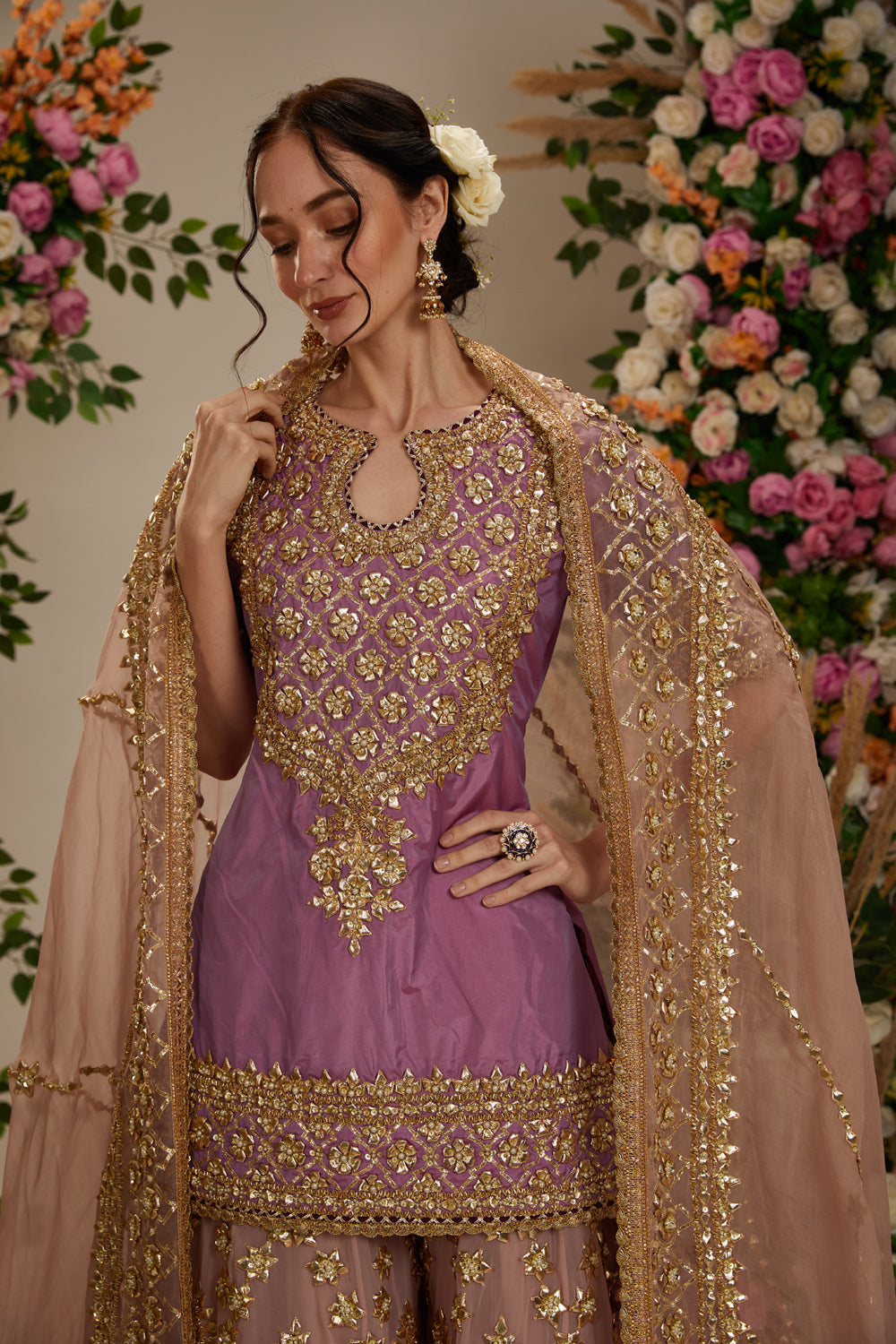 Georgette short kurta paired with sharara with handmade gota work shimmering threads and delicate patterns with pure organza dupatta