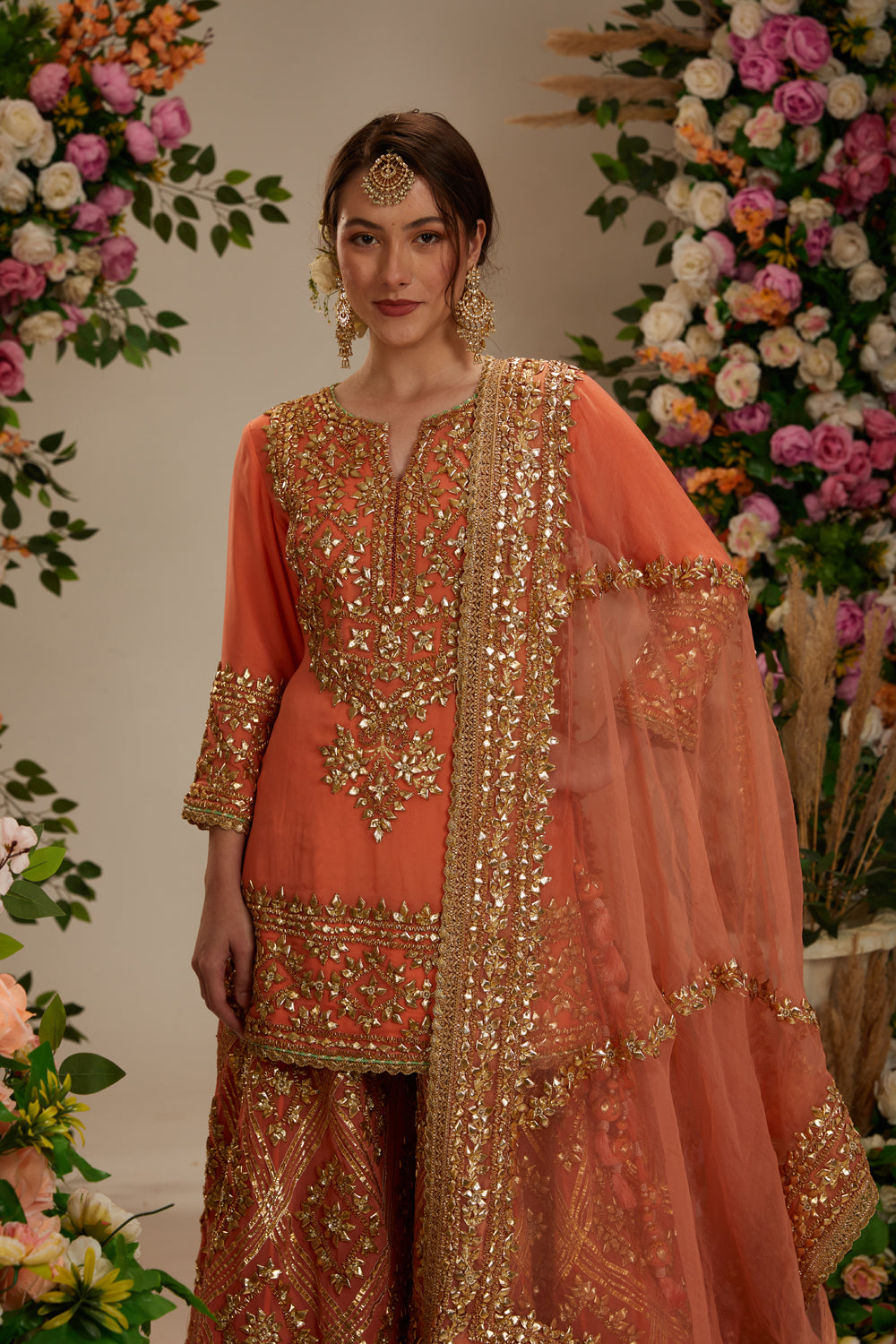 Peach georgette kurta with intricate gandmade gota work paired with sharara