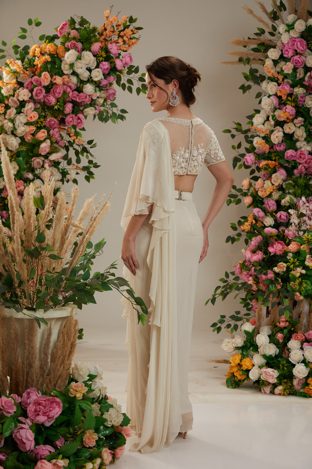 Introducing our elios collection, presenting an exquisite georgette drape saree with intricate cutdana, sequin, and moti embroidery work that adds a touch of glamour. paired elegantly with a net blouse featuring stunning embellishments, this saree ensemble embodies timeless sophistication and impeccable craftsmanship for a mesmerizing look. exquisite embroidery on net fabric blouse , paired with a stunning georgette drape saree creating an elegant silhouette that defines the elios collection.