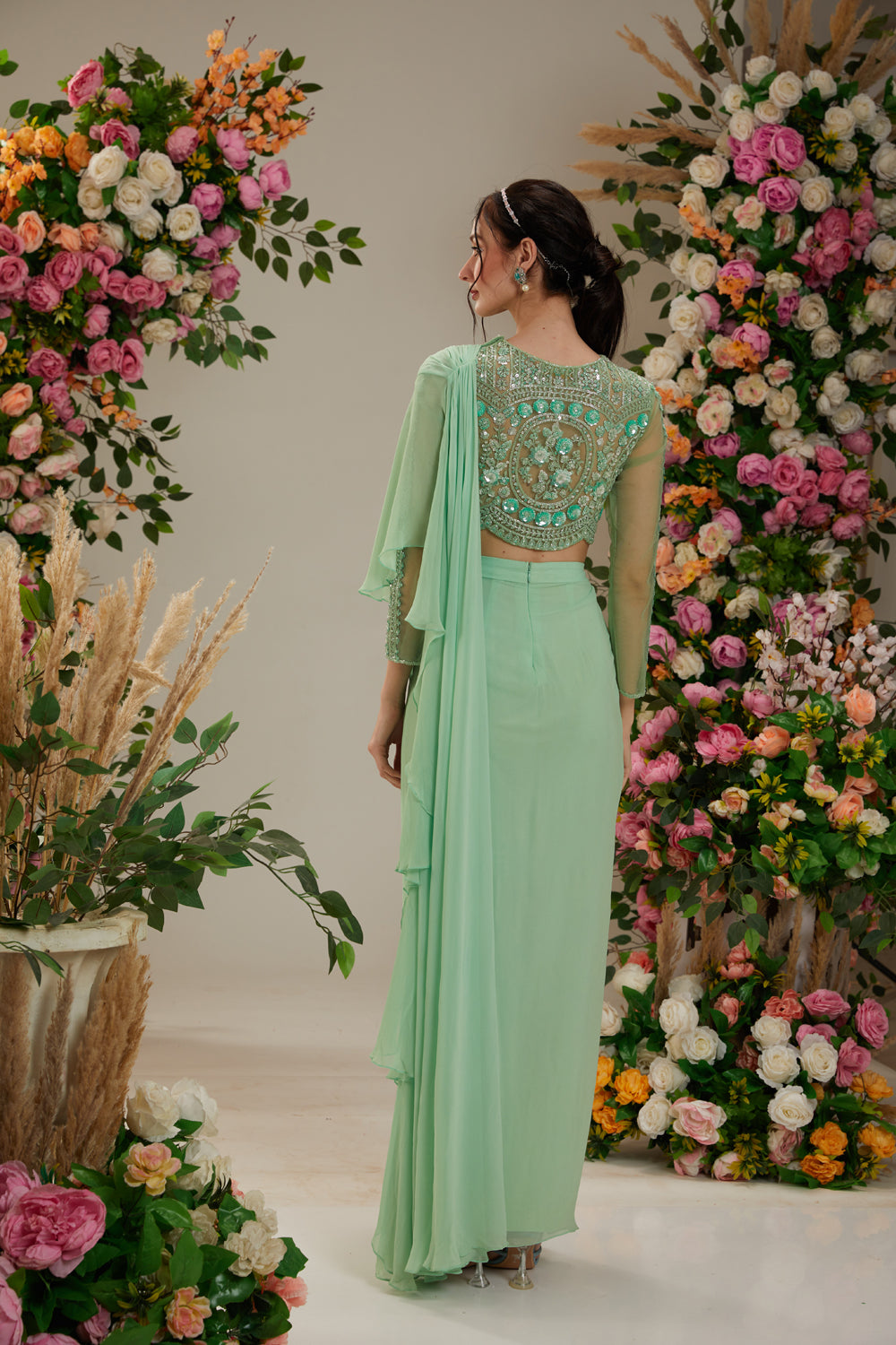 Introducing our elios collection, presenting an exquisite georgette drape saree with intricate cutdana, sequin, and moti embroidery work that adds a touch of glamour. paired elegantly with a net blouse featuring stunning embellishments, this saree ensemble embodies timeless sophistication and impeccable craftsmanship for a mesmerizing look. exquisite embroidery on net fabric blouse , paired with a stunning georgette drape saree creating an elegant silhouette that defines the elios collection.