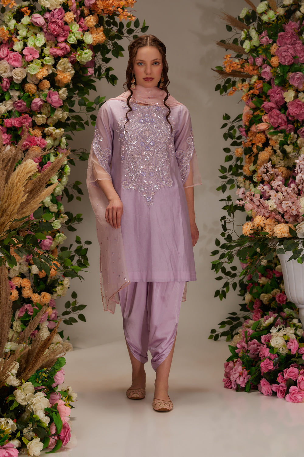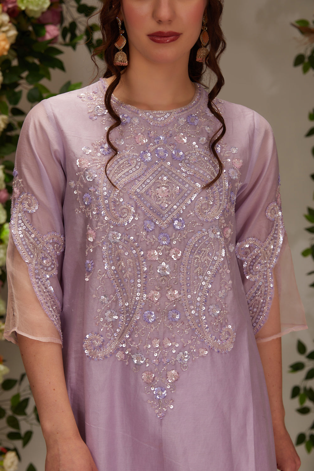 Introducing the "x" collection: a chic mauve chanderi short a-line kurta set paired with stylish samosa pants and an ethereal organza dupatta. handcrafted with intricate shimmering sequins, this ensemble exudes timeless elegance and charm, perfect for special occasions.