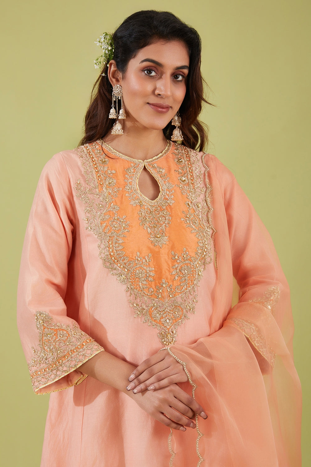 Pink short kalidar kurta , intricately detailed with gathered gota and patchwork, embellished with shimmering moti, sequins and enriched with zari nakshi embroidery paired with matching salwar and delicate pink organza dupatta