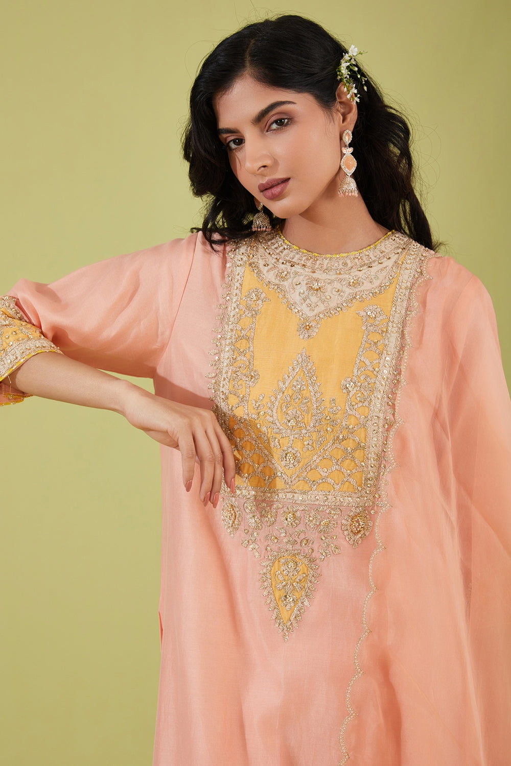 Pink long kurta , intricately detailed with gathered gota and patchwork, embellished with shimmering moti, sequins and enriched with zari nakshi embroidery paired with matching salwar and delicate pink organza dupatta