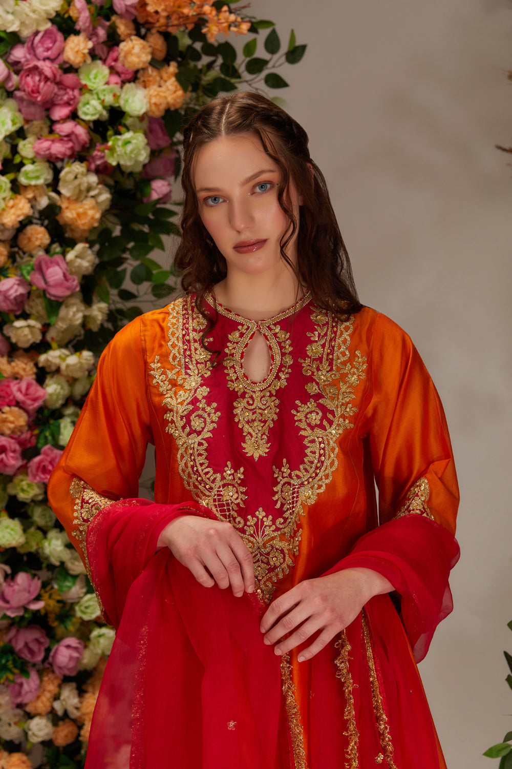 Introducing the "sada bahaar " collection: a orange long kalidar kurta set paired with a fushia dupatta and salwar. inspired by festive hues handcrafted with intricate handwork, including delicate gota detailing and shimmering moti sequins, for a look that exudes elegance and charm.