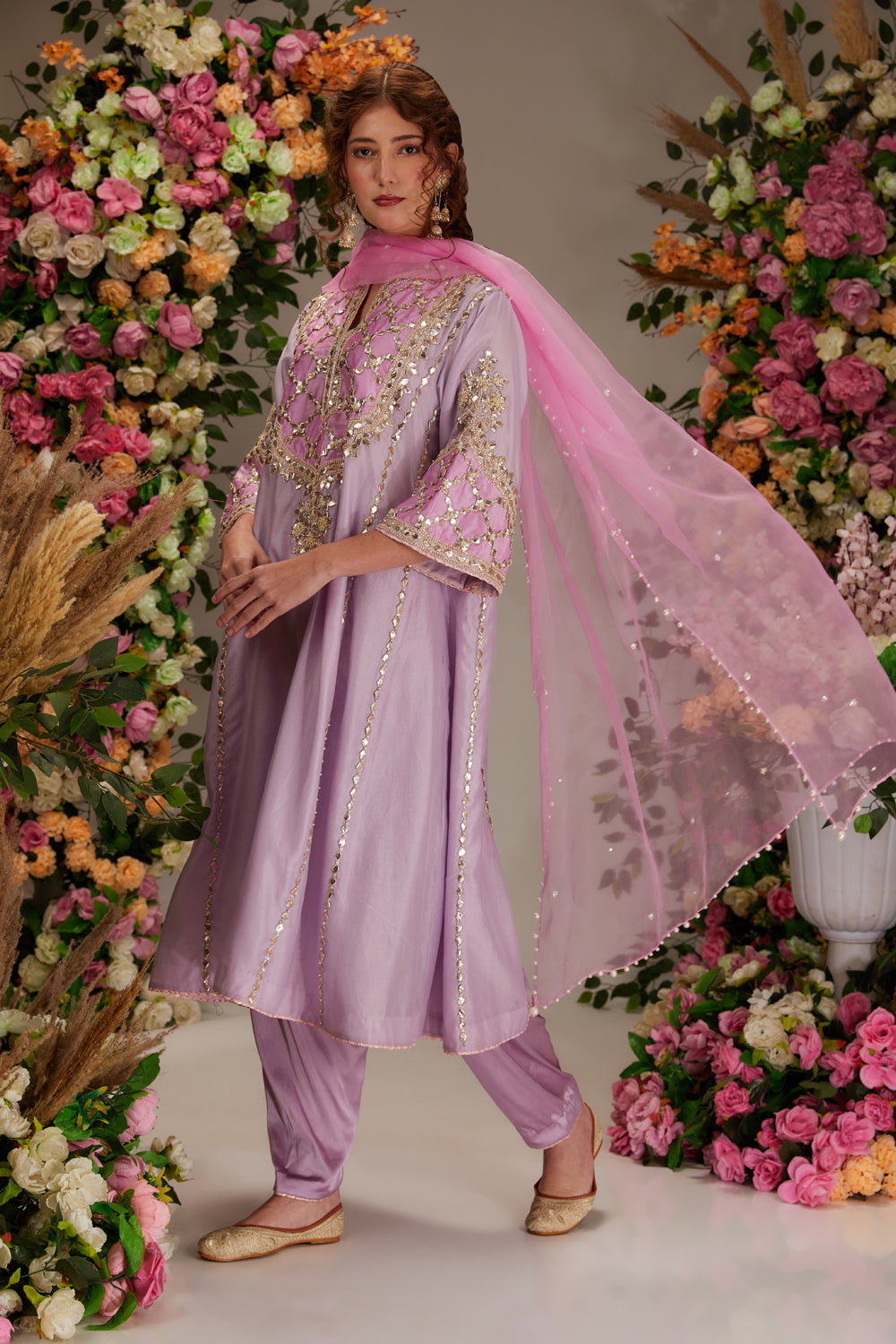 Introducing the "sada bahaar" collection: a mauve long kalidar kurta set paired with an matching dupatta and salwar. inspired by festive hues handcrafted with intricate handwork, including delicate gota detailing and shimmering moti sequins, for a look that exudes elegance and charm.