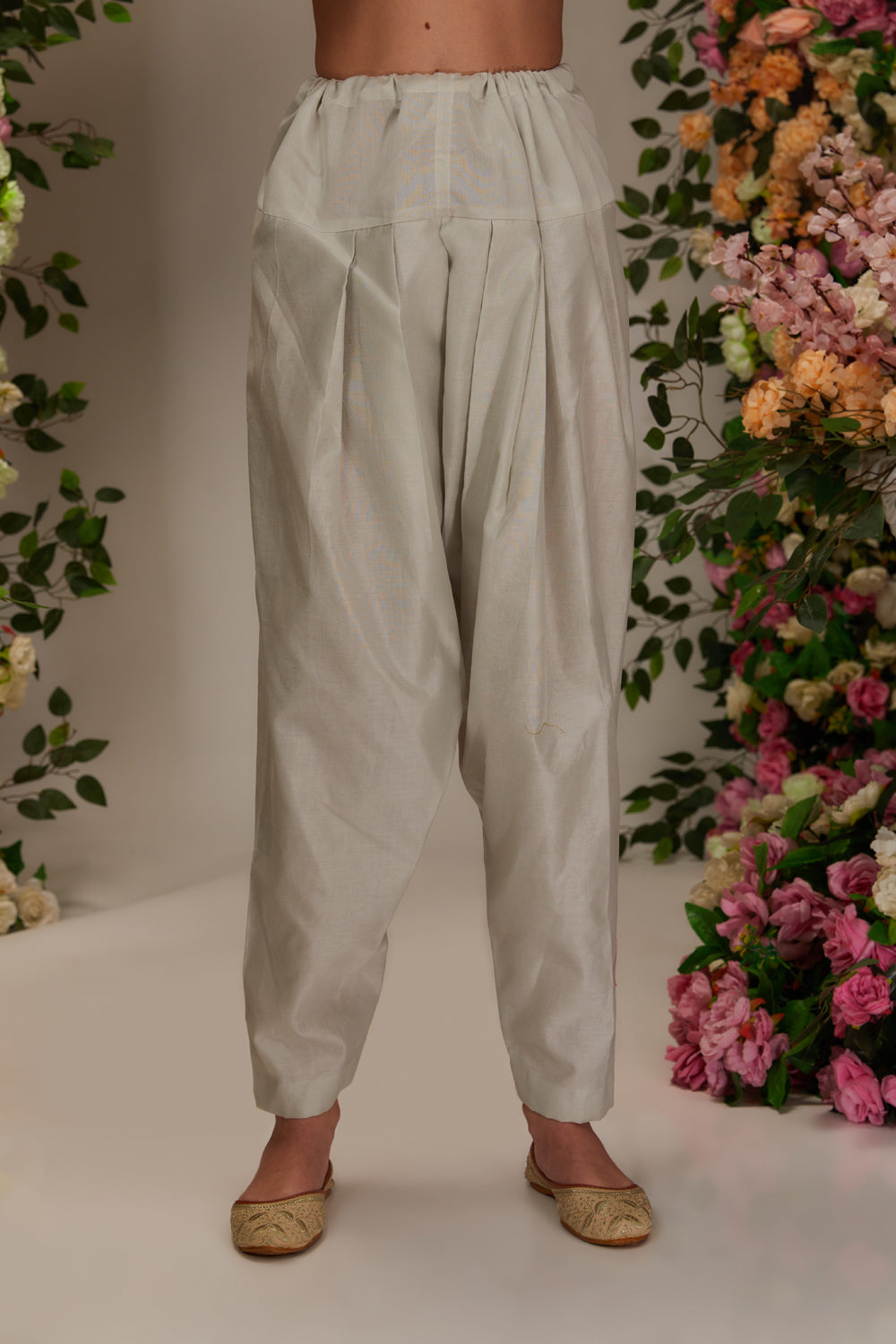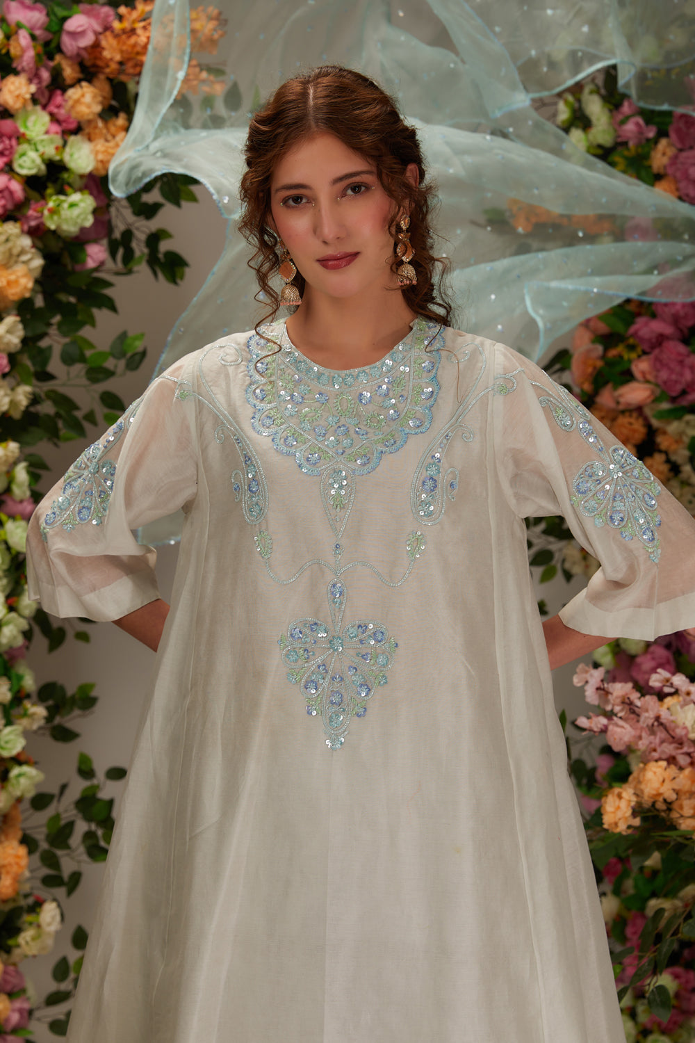 Introducing the "x" collection: a chic light grey chanderi short kalidar kurta set paired with salwar and an ethereal organza dupatta. handcrafted with intricate shimmering sequins, this ensemble exudes timeless elegance and charm, perfect for special occasions.