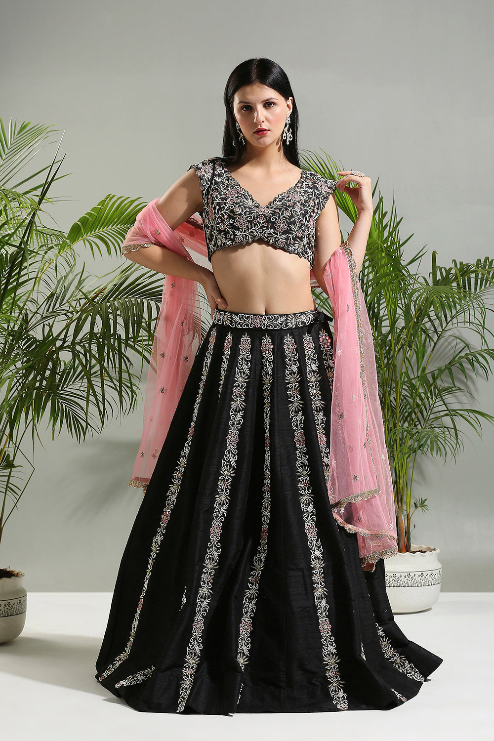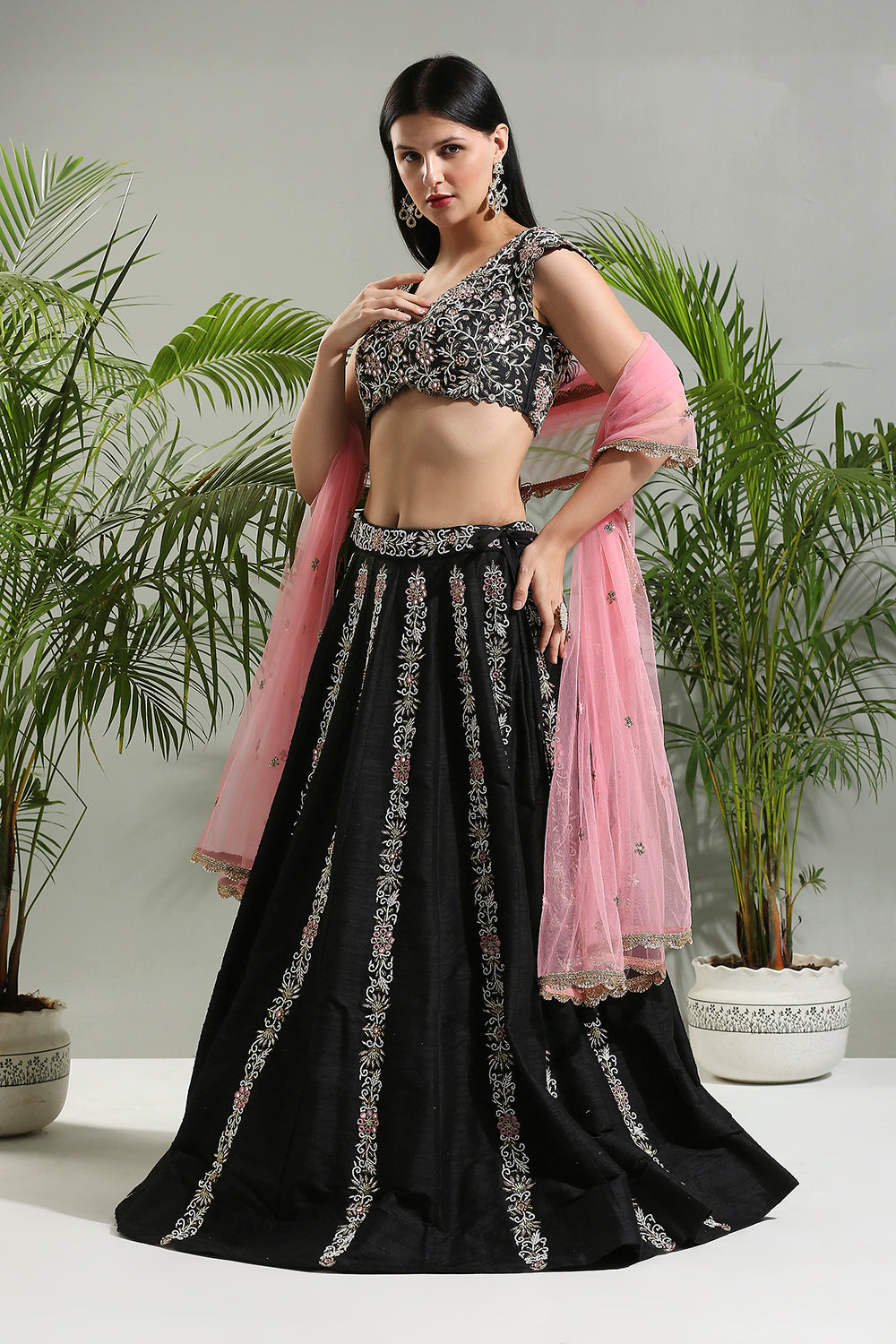 Black And Pink Thread And Mirror Hand Embroidered Lehenga Set