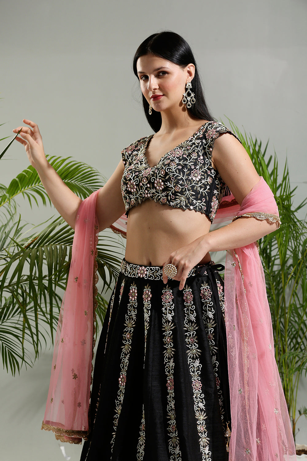 Black raw silk lehenga set with intricate mirror, thread, beads and zardozi hand embroidery and cutwork detailing, paired with blush pink tulle zardozi work dupatta