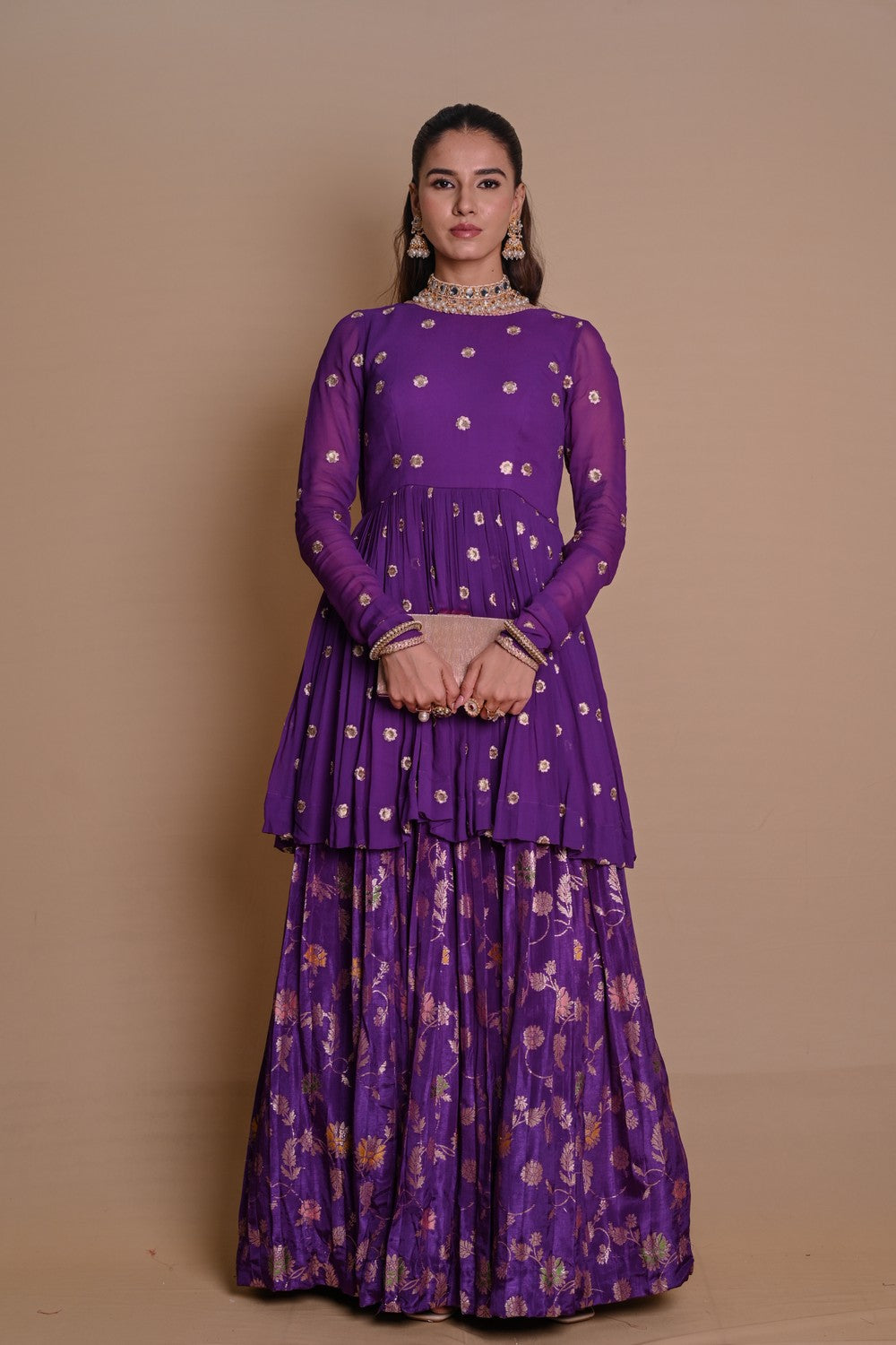 Materials: Peplum- Georgette, Jacket- Jacquard silk, Lehenga- Jacquard silk, Dupatta- Georgette