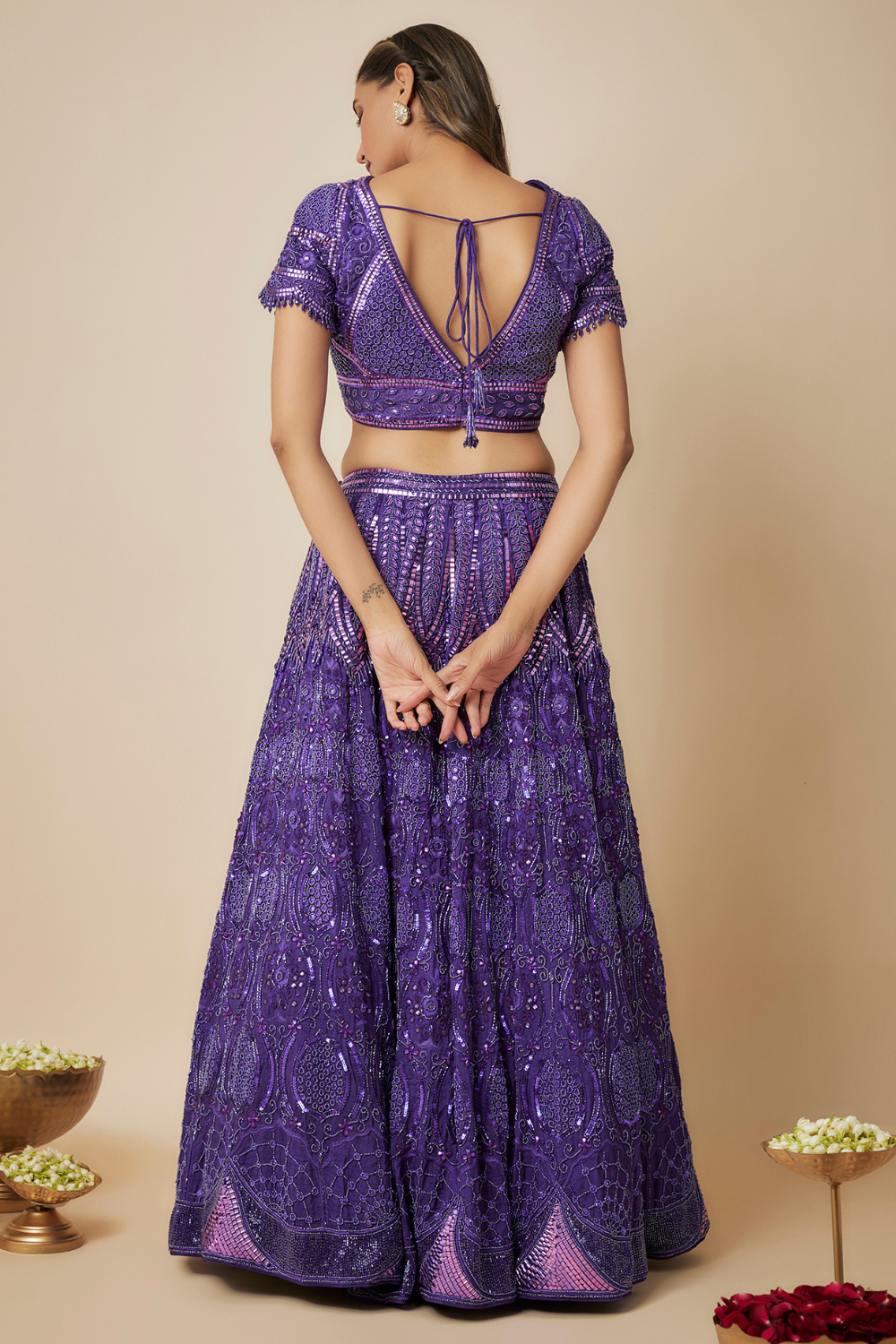 Make a bold statement with this exquisite bright purple lehenga set, crafted for those who love to stand out. The intricately embroidered choli and lehenga are paired with a delicate organza dupatta, exuding elegance and class. Perfect for brides or mothers of the bride or groom, its scalloped sleeves adorned with tassels add a unique touch of design. Shimmering and chic, it’s ideal for sangeet or cocktail nights, letting you dazzle as you dance the night away.