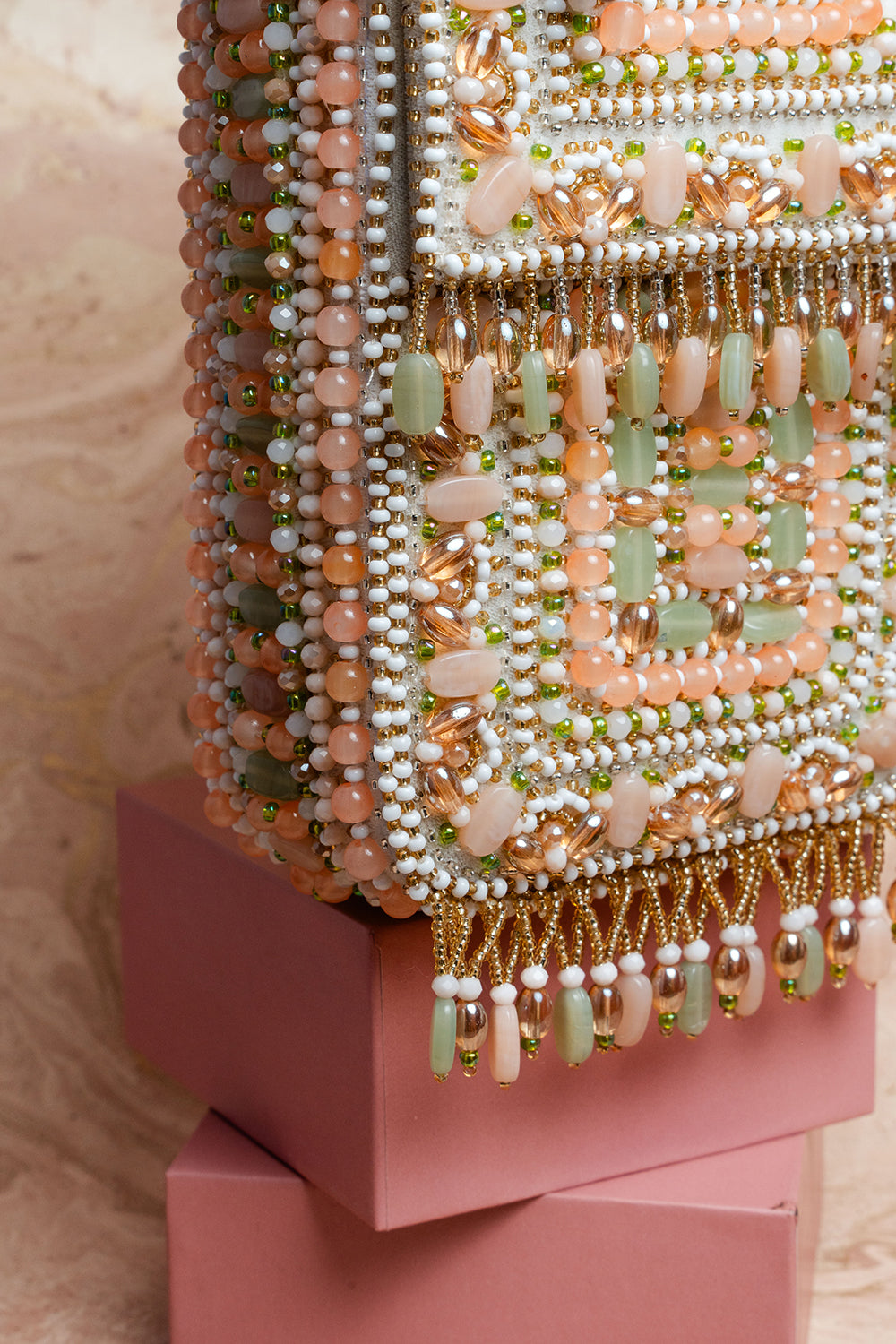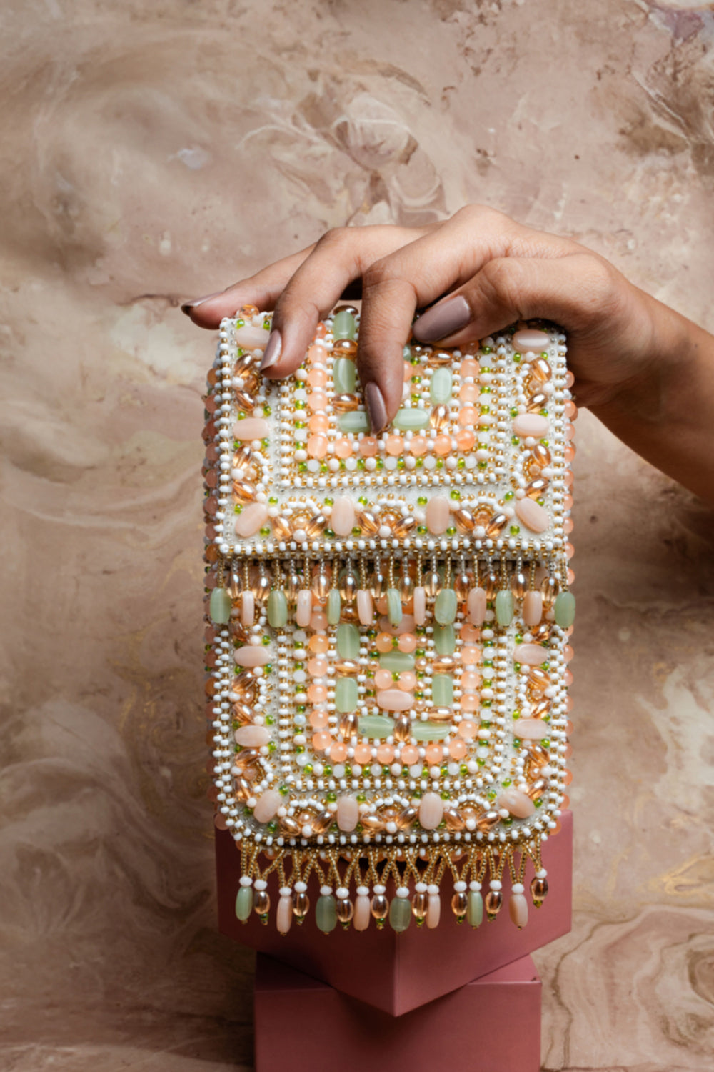 A chic yet stand out piece dressed with pastel beadwork that come together in a studded box clutch and a bead finish in the handle