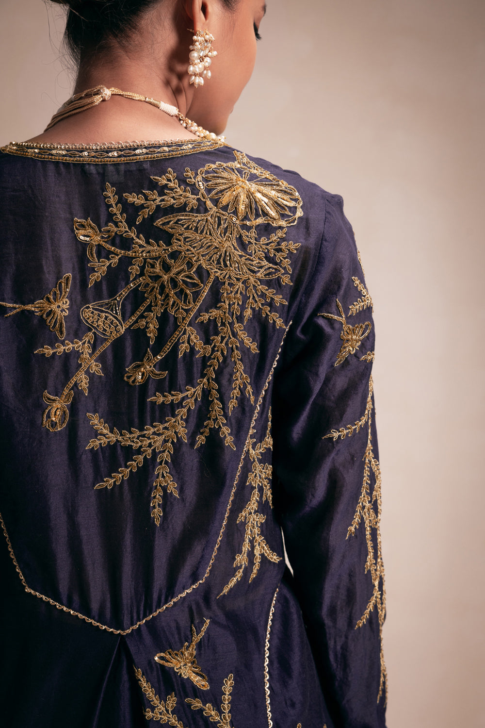 Blue kurta in chanderi base with gold hand and machine embroidery with churidar