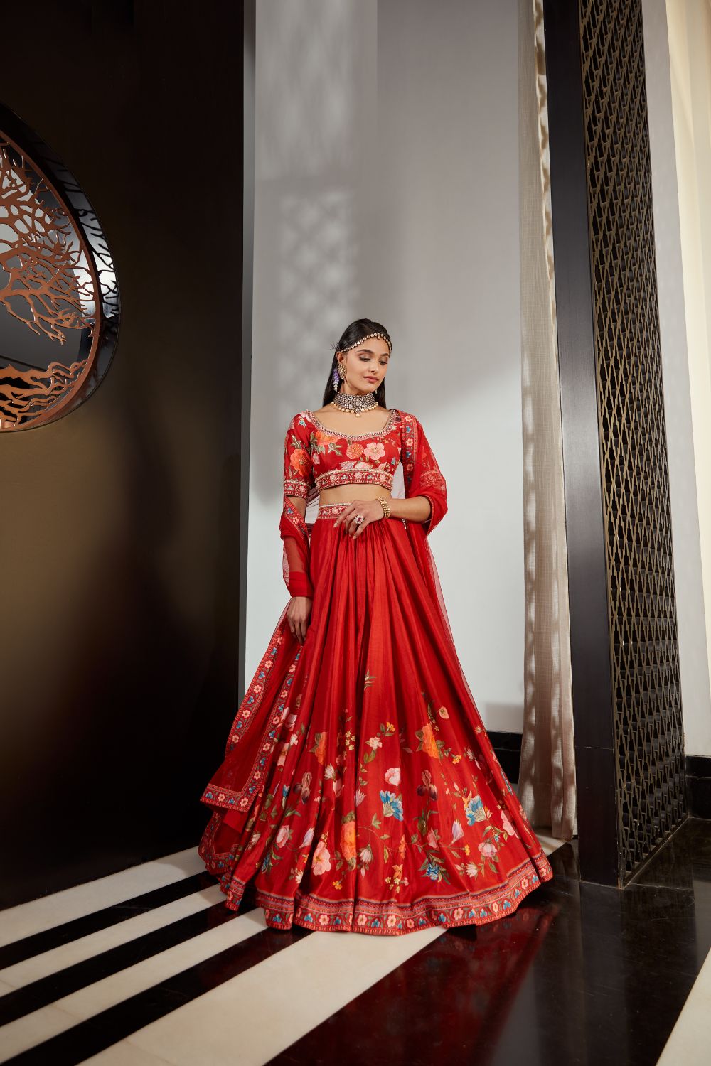 Silk printed embroidered skirt and blouse paired with net dupatta
