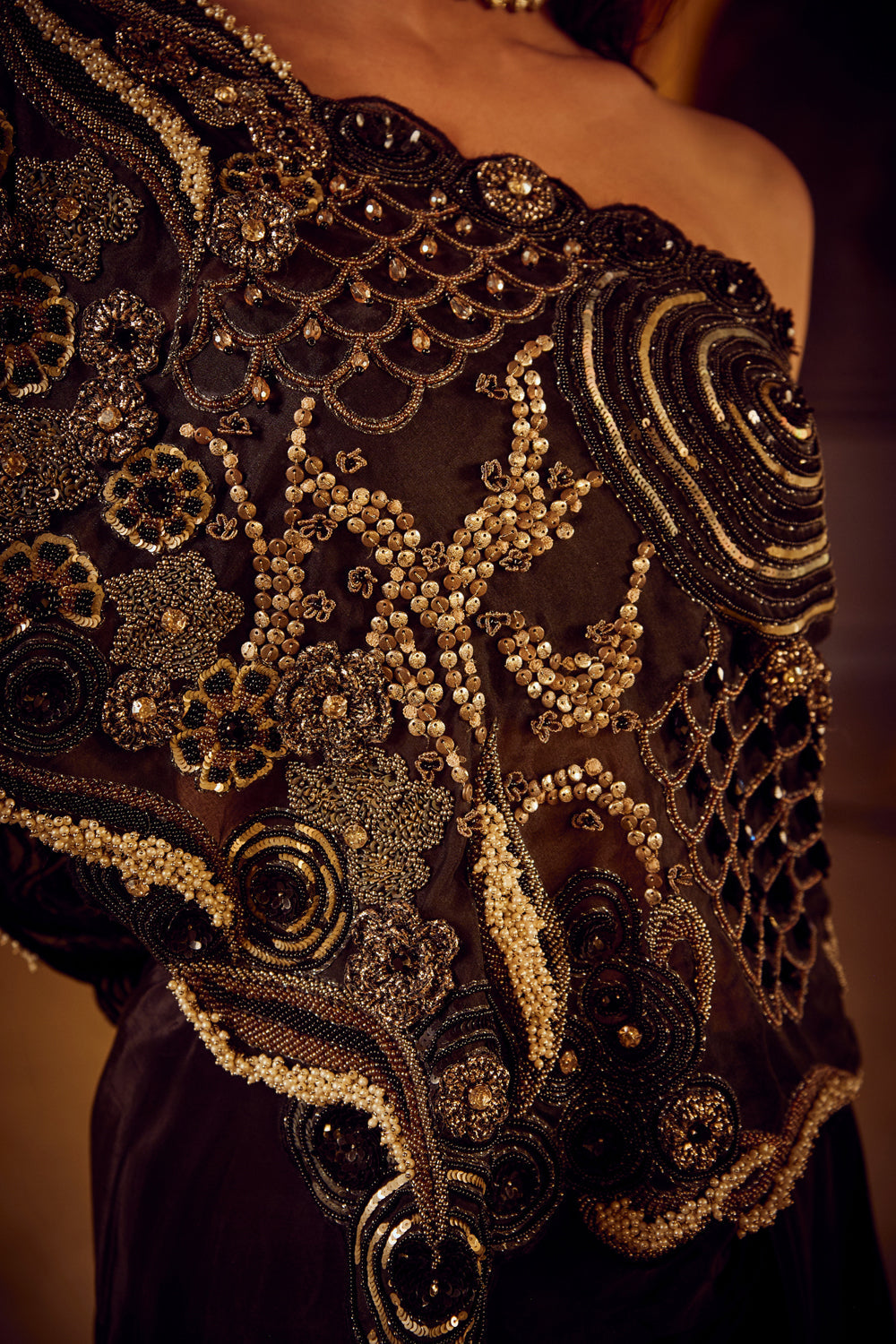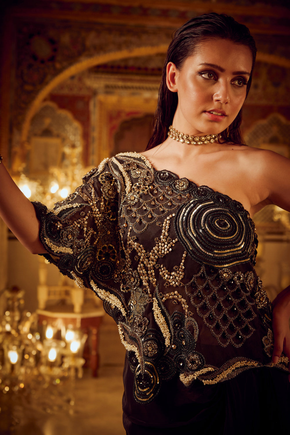 This ensemble features a gorgeous silk organza asymmetrical top adorned with intricate floral and abstract embroidery, paired with a draped crepe skirt