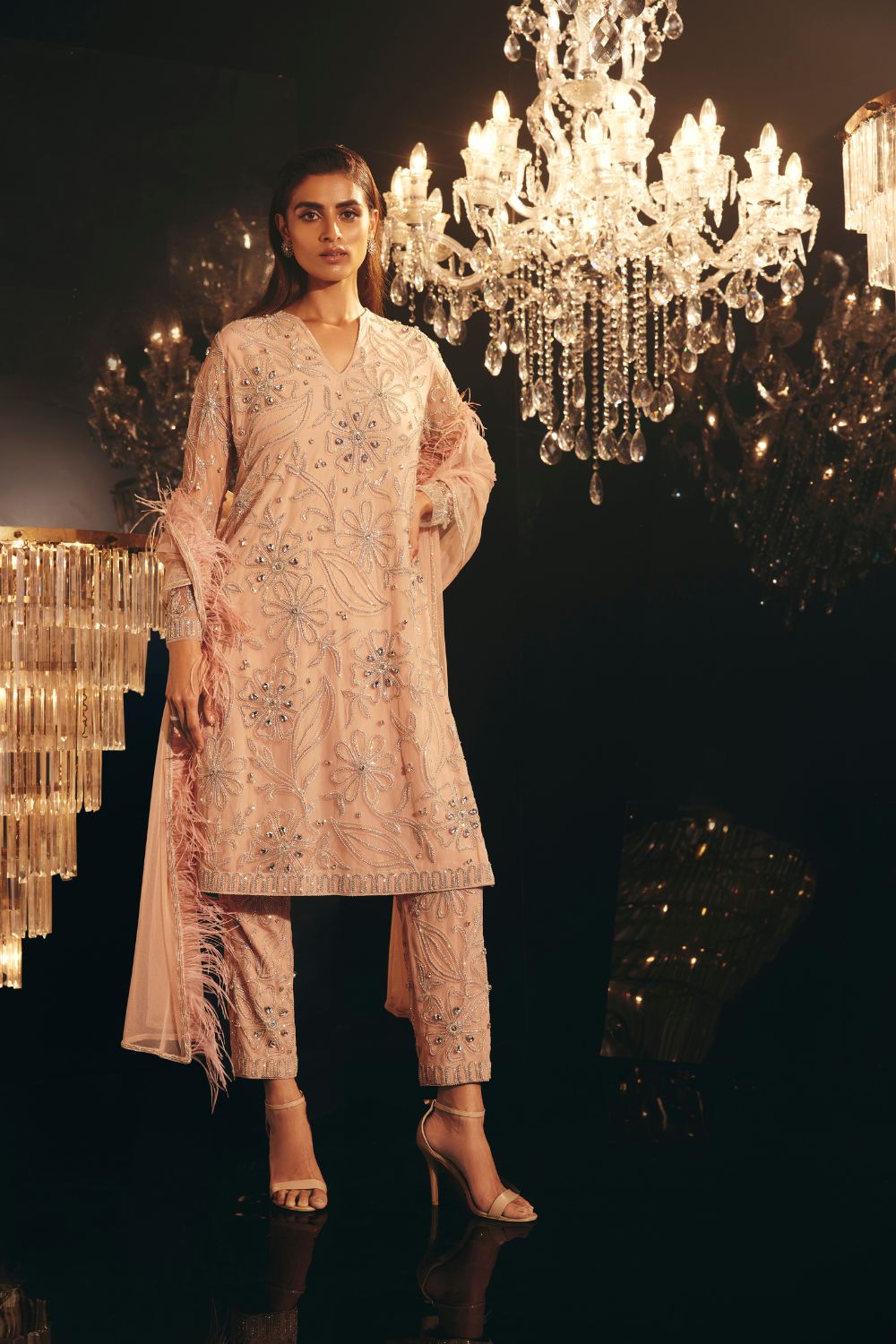 Beige pink heavy all over embroidered net kurta and pants paired with net embroidered feather embellished dupatta