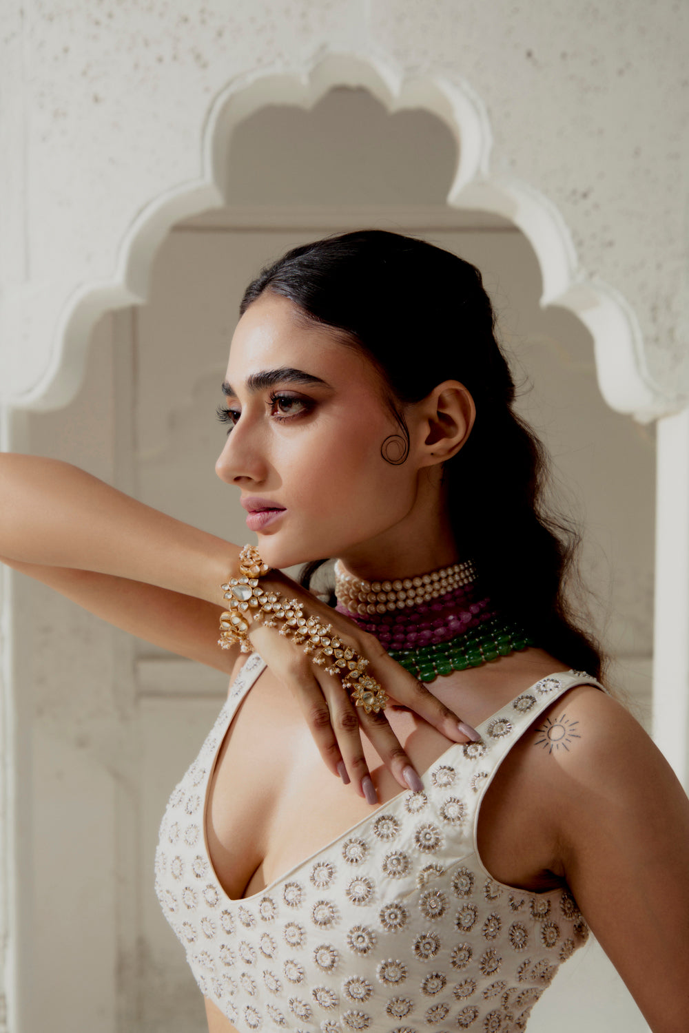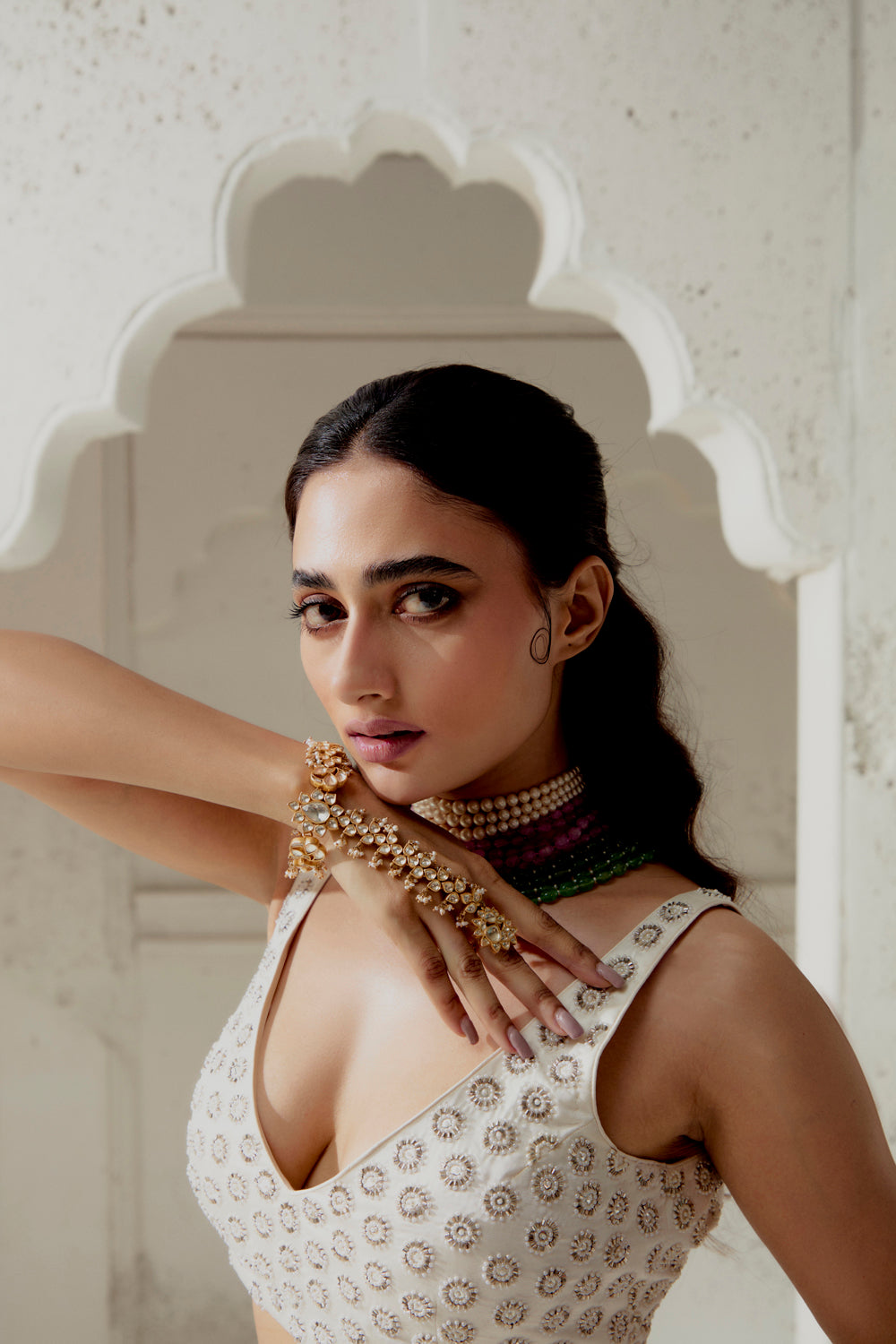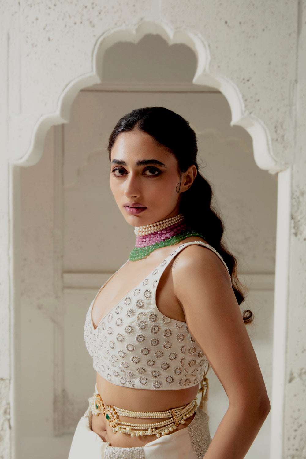 Silk satin saree with woven gota edging. intricate mixed medium hand embroidred blouse. model is wearing a size 8 blouse.
