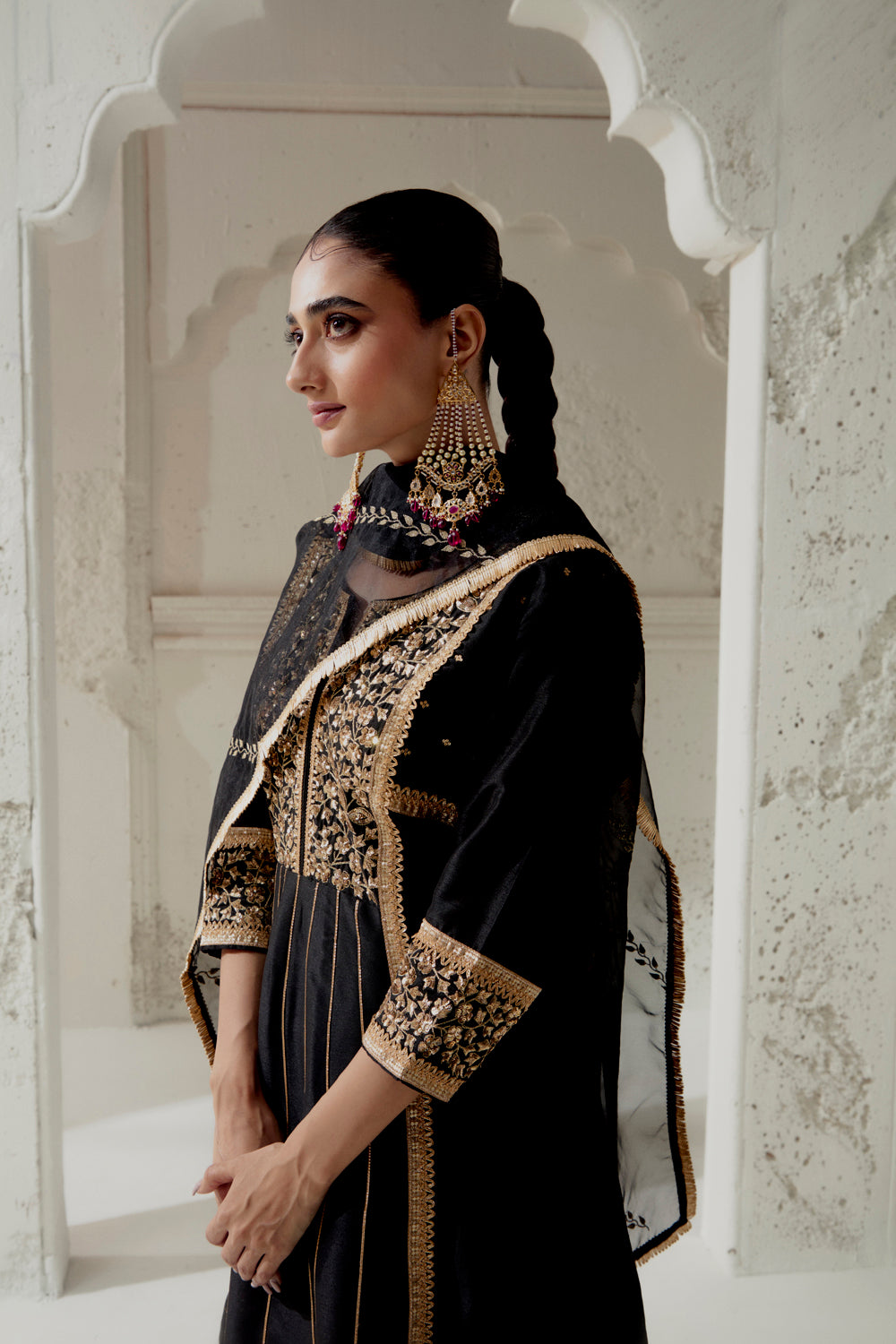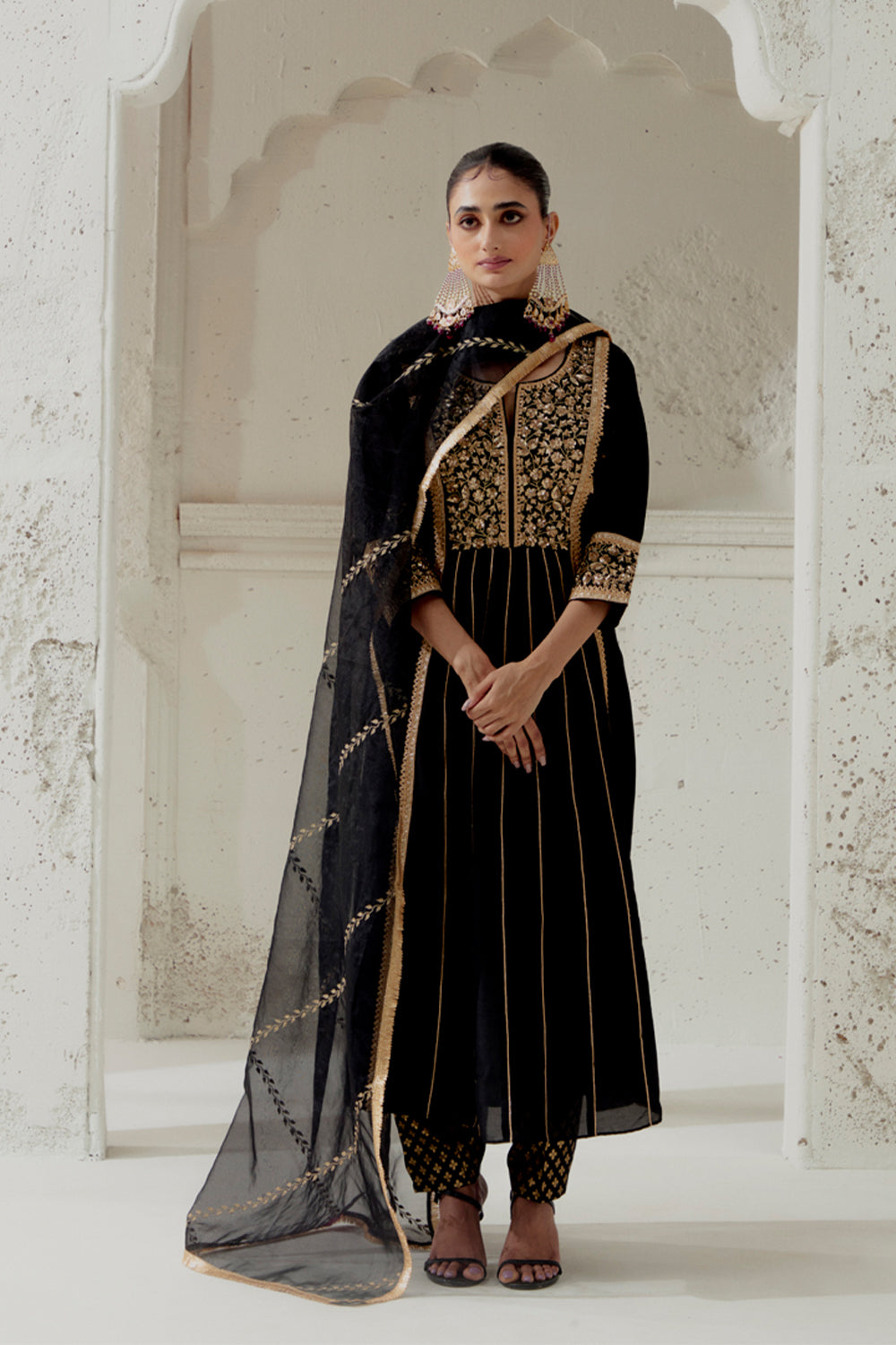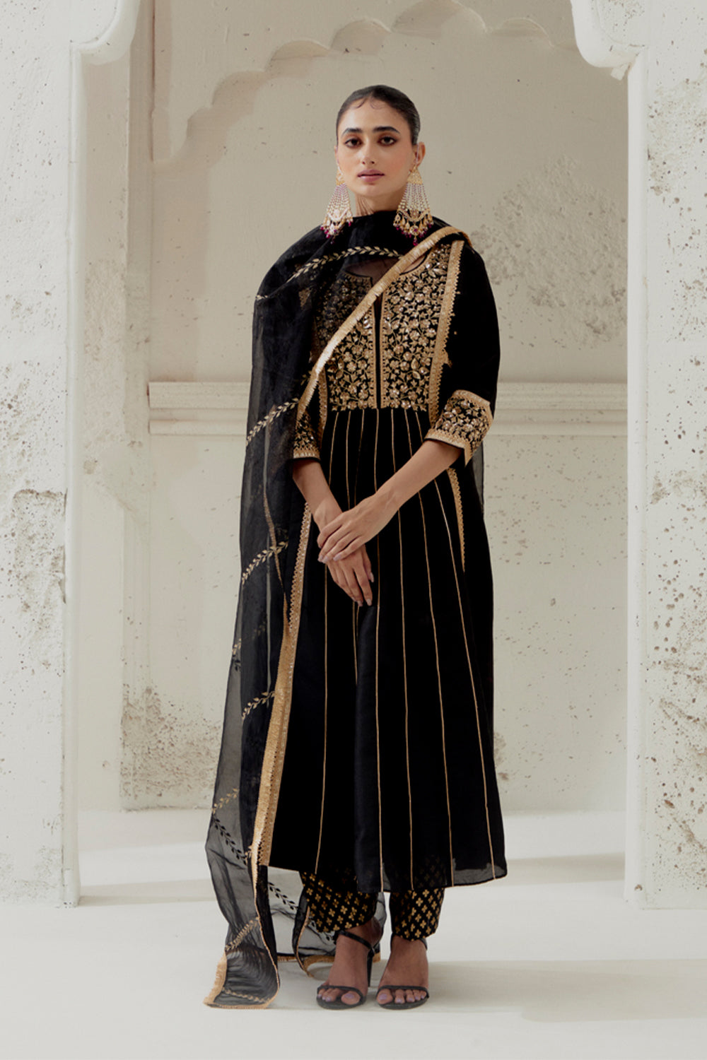 Blended silk kalidar cut kurta with our signature floral mixed medium hand embroidred yoke panel and cuffs. paired up with a chanderi dogri salwar and embroidred organza dupatta.