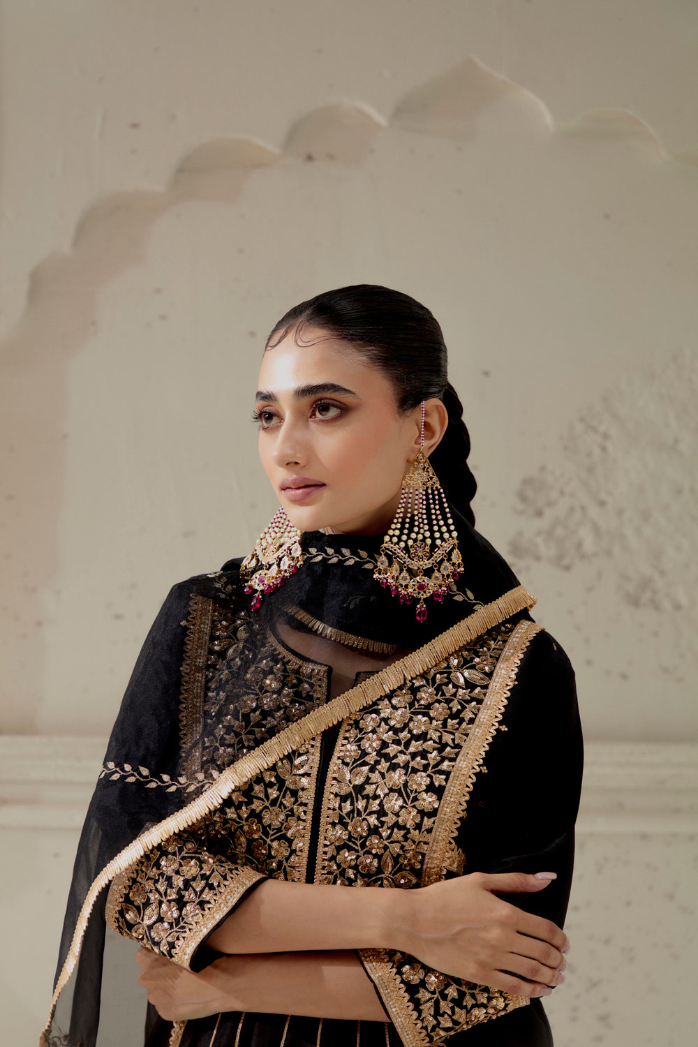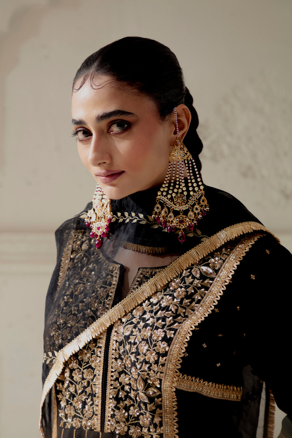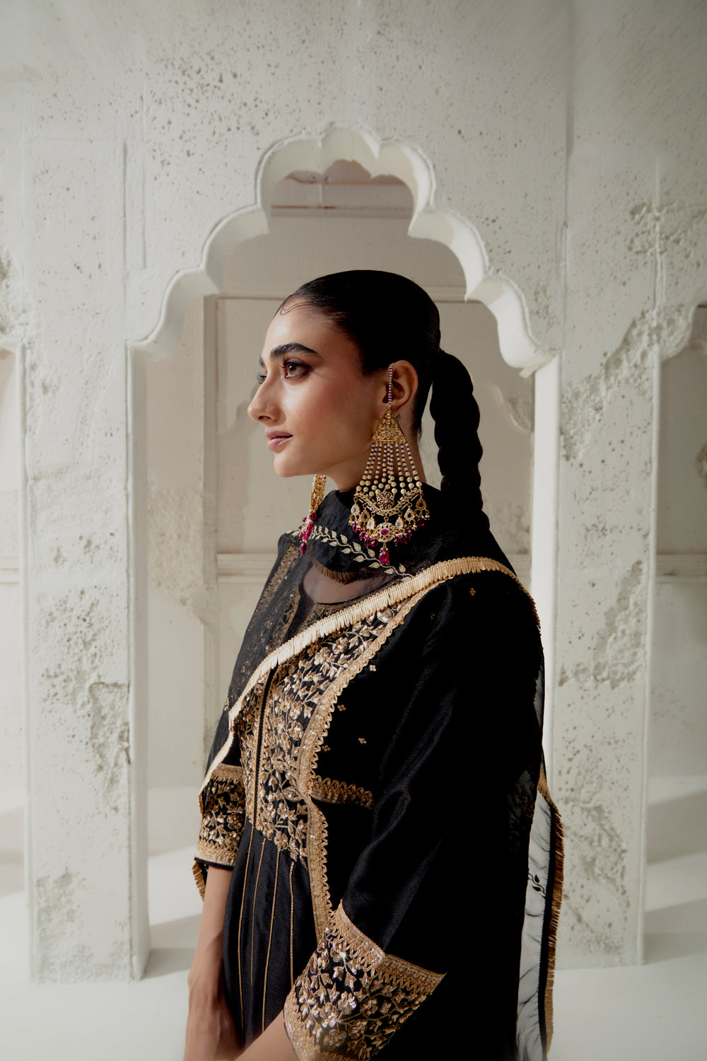 Blended silk kalidar cut kurta with our signature floral mixed medium hand embroidred yoke panel and cuffs. paired up with a chanderi dogri salwar and embroidred organza dupatta.