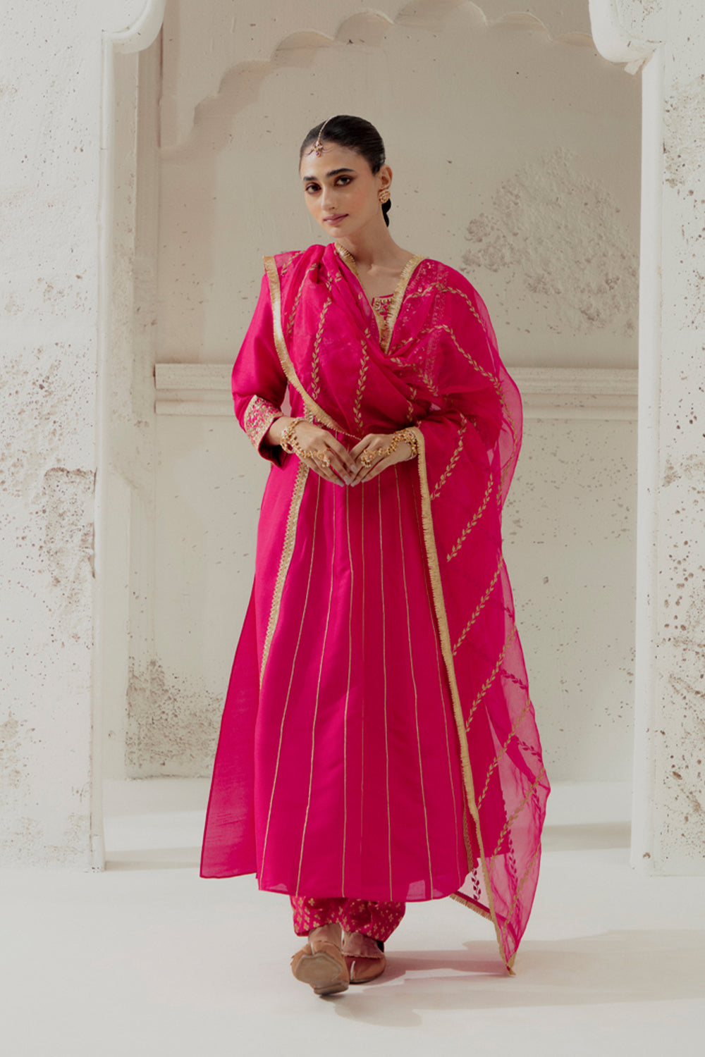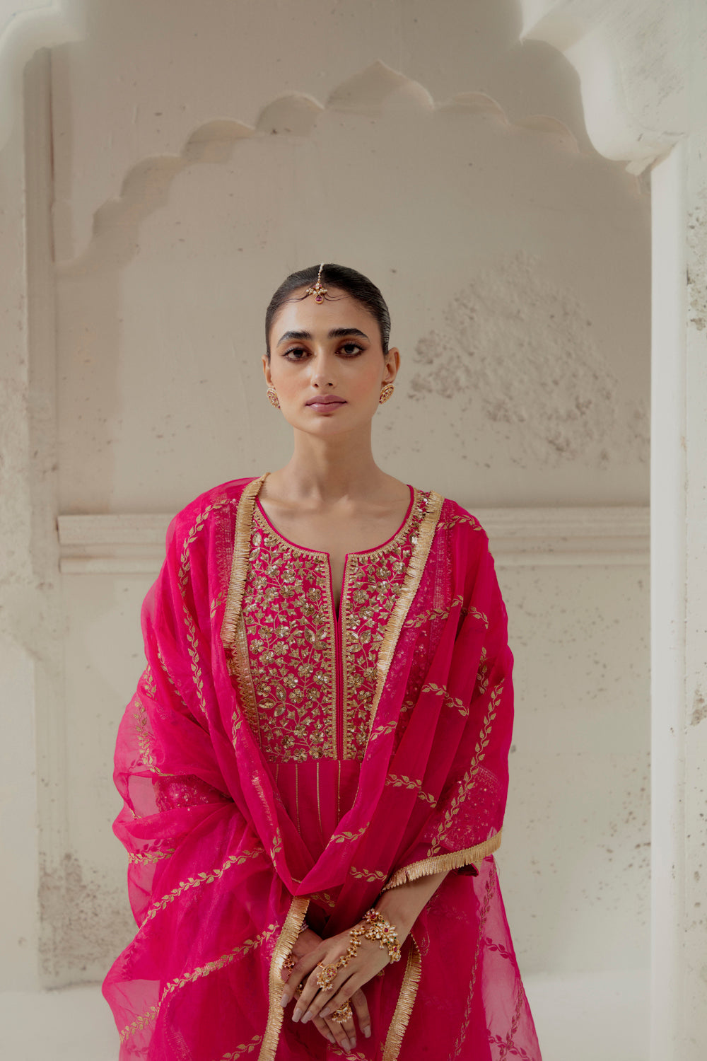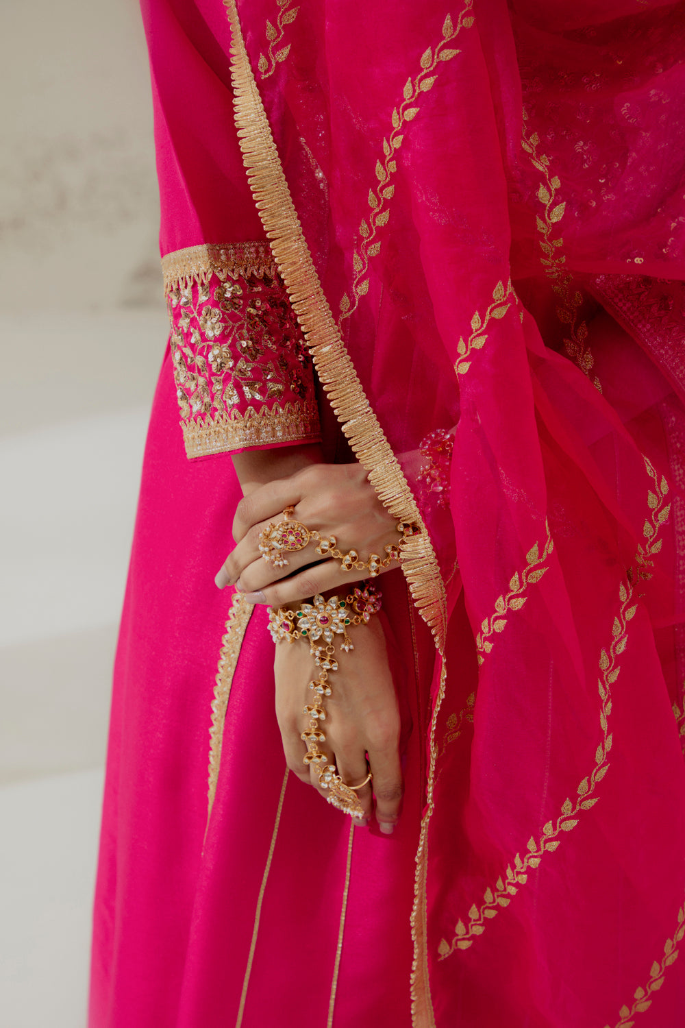 Blended silk kalidar cut kurta with our signature floral mixed medium hand embroidred yoke panel and cuffs. paired up with a chanderi dogri salwar and embroidred organza dupatta.