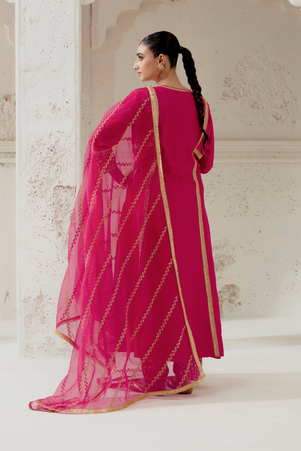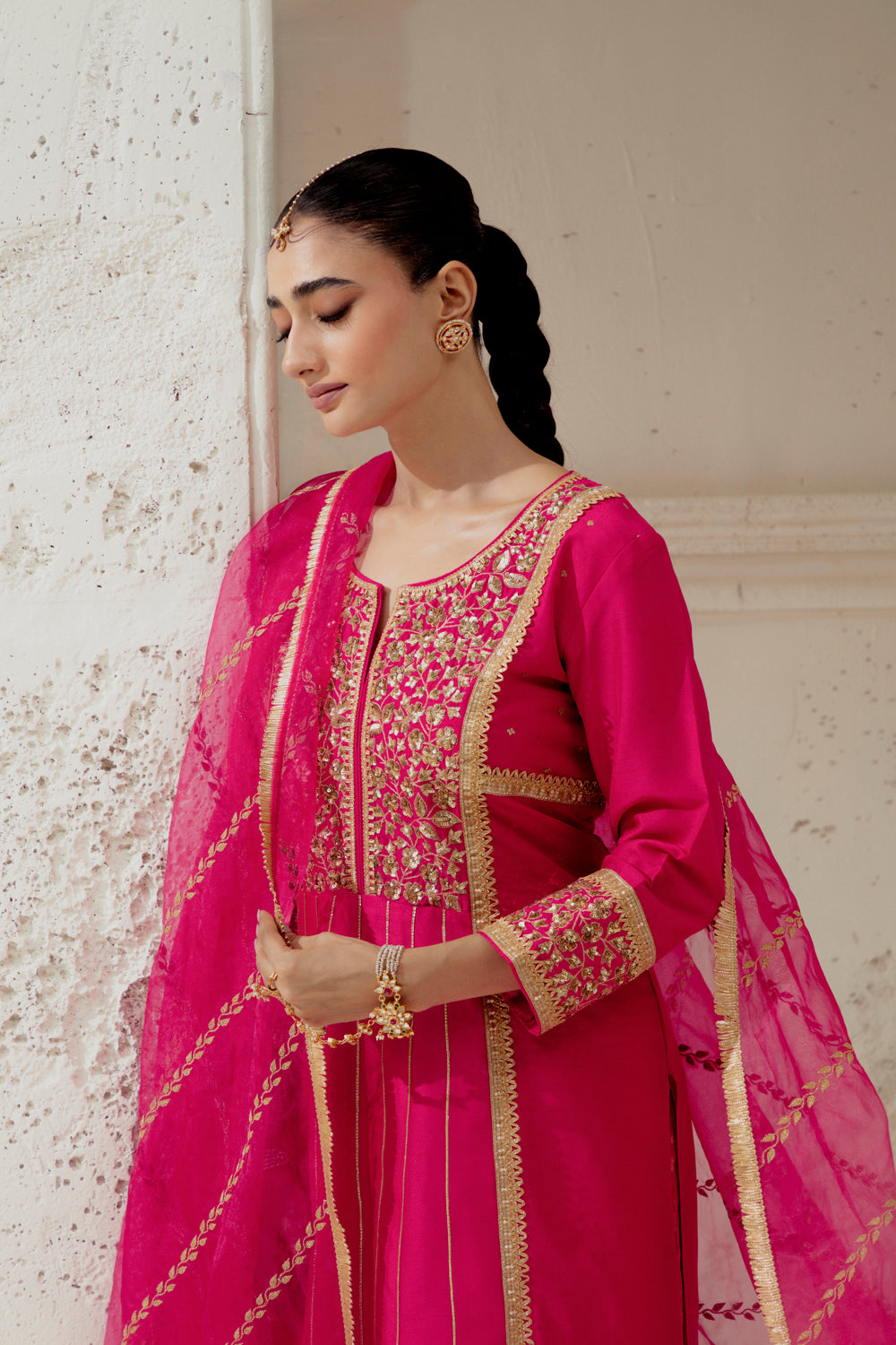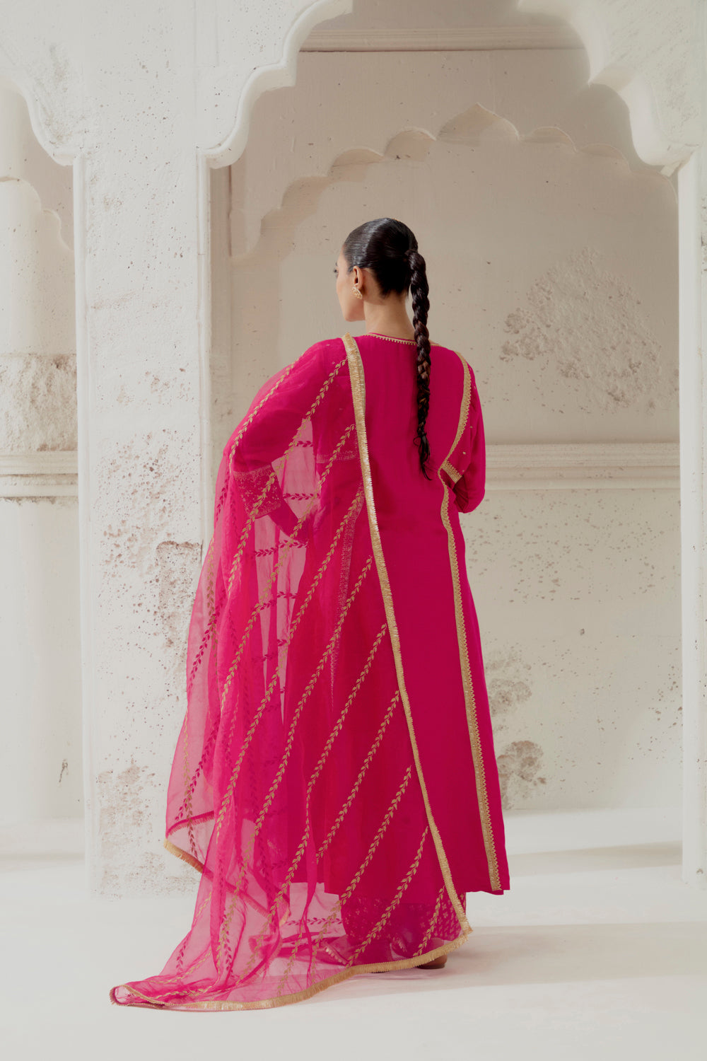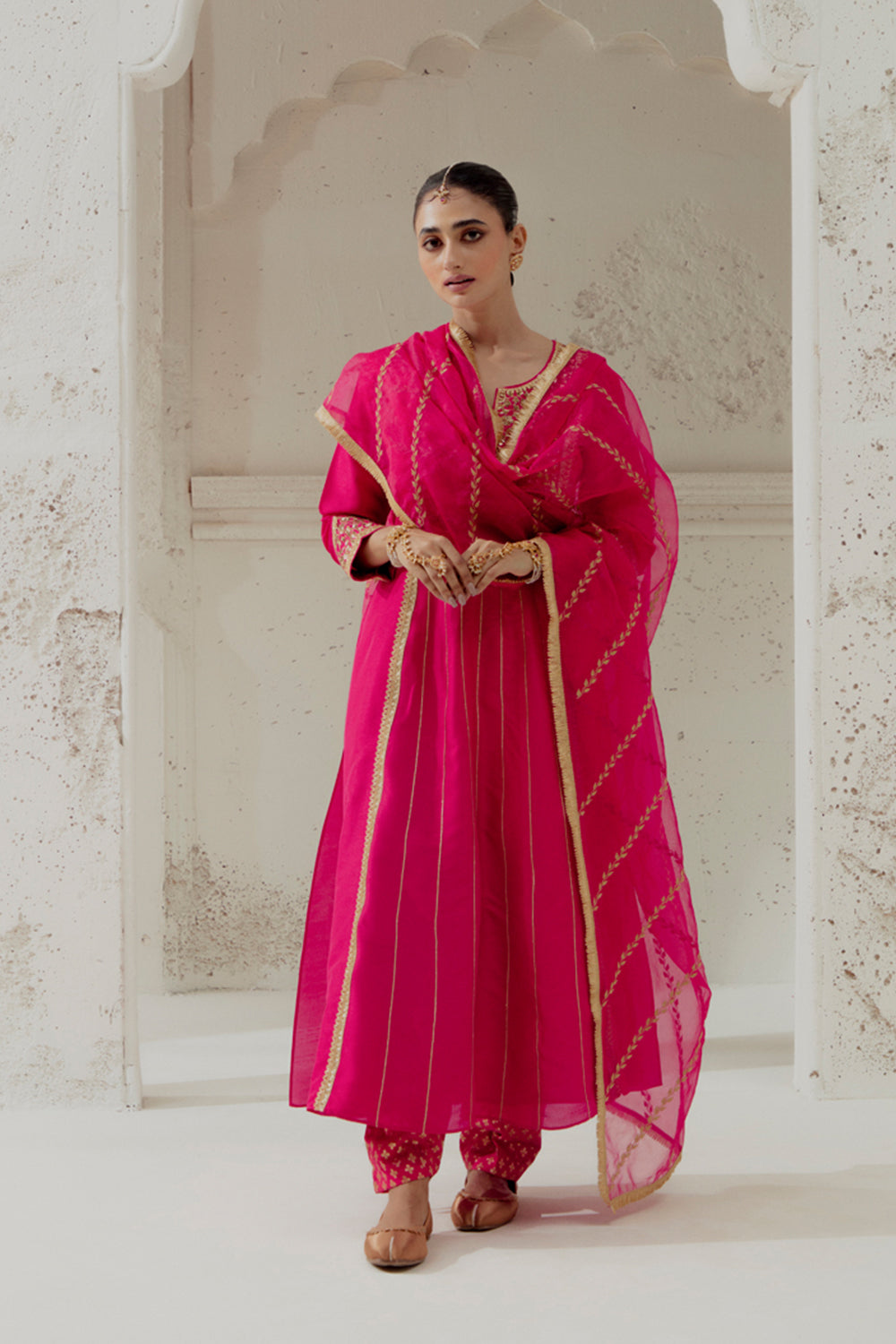 Blended silk kalidar cut kurta with our signature floral mixed medium hand embroidred yoke panel and cuffs. paired up with a chanderi dogri salwar and embroidred organza dupatta.
