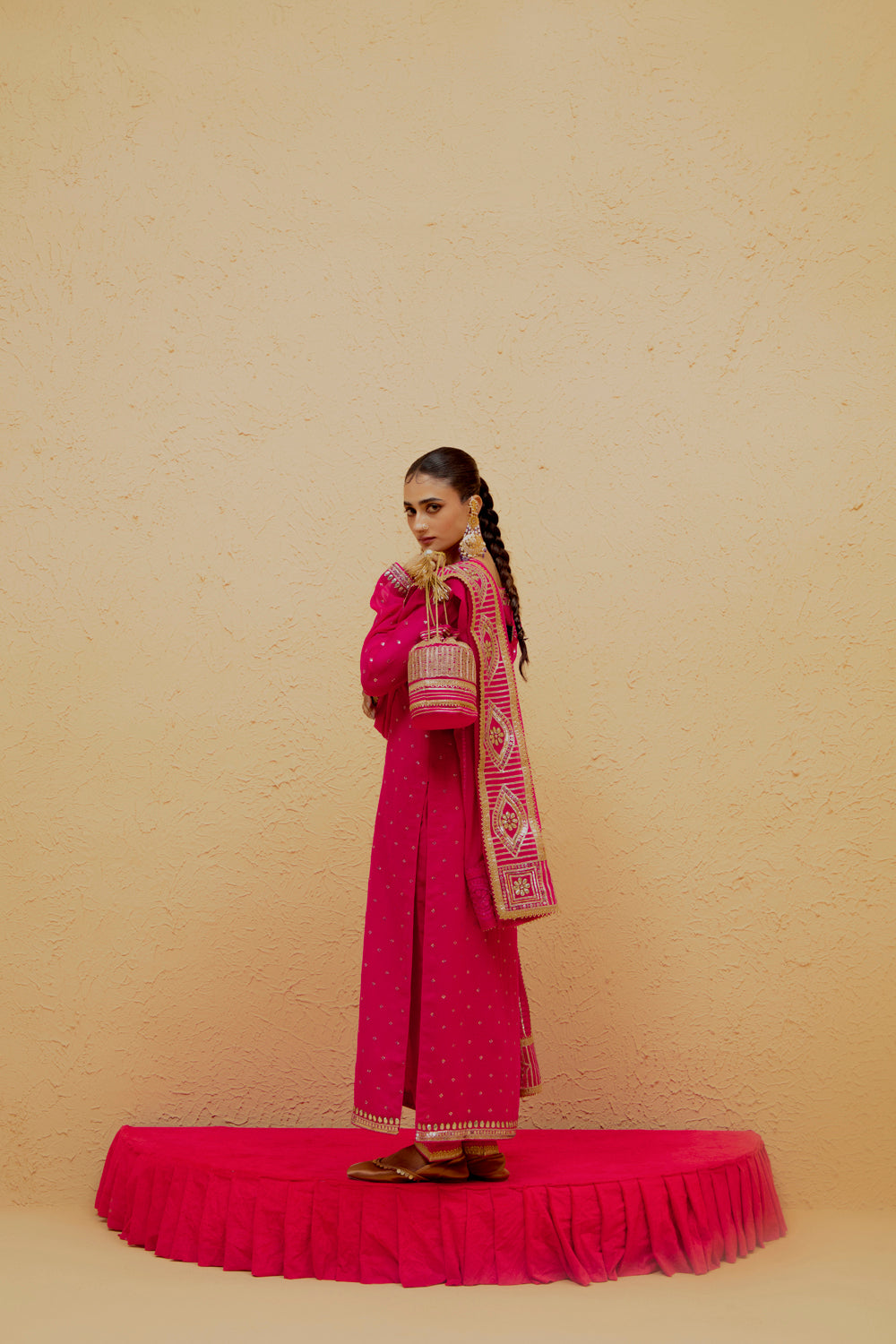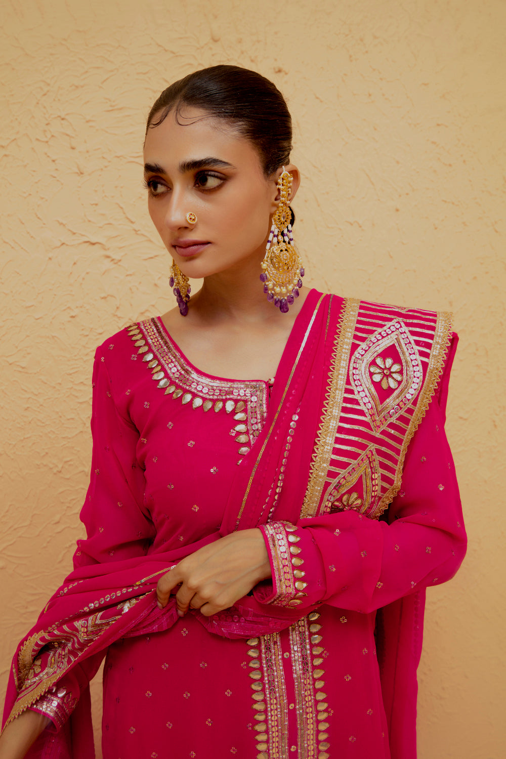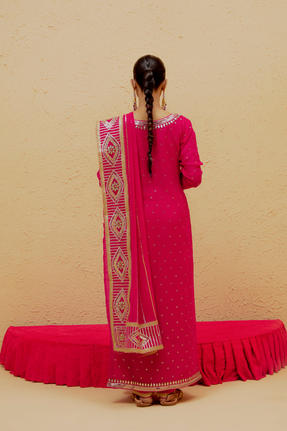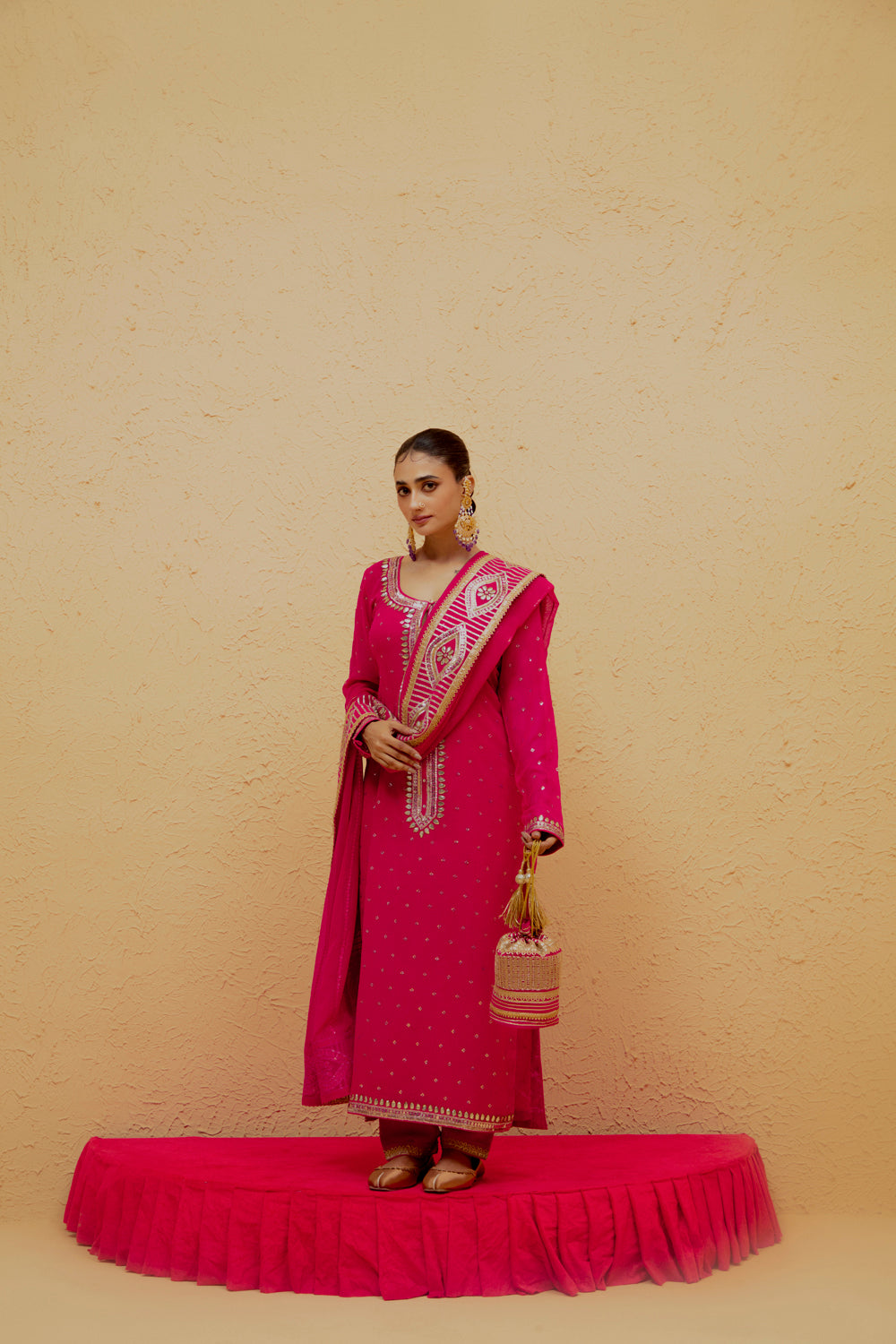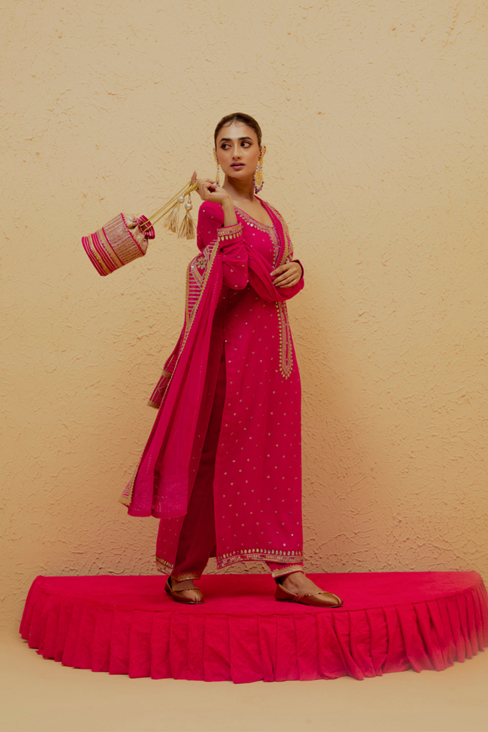 long georgette kurta with gota patti detailings on the necklines hem and cuffs. paired with a gorgeous hand embroidred gota and mixed medium duptta and pants.