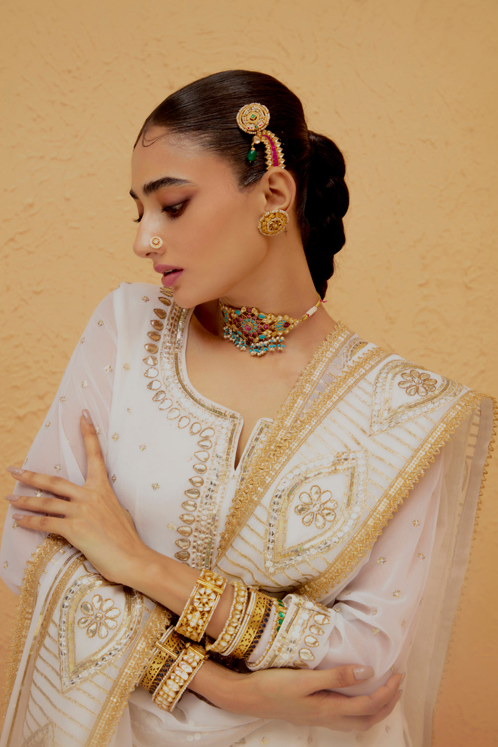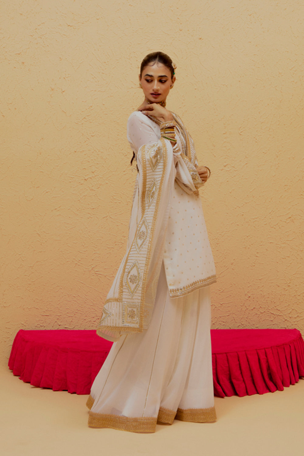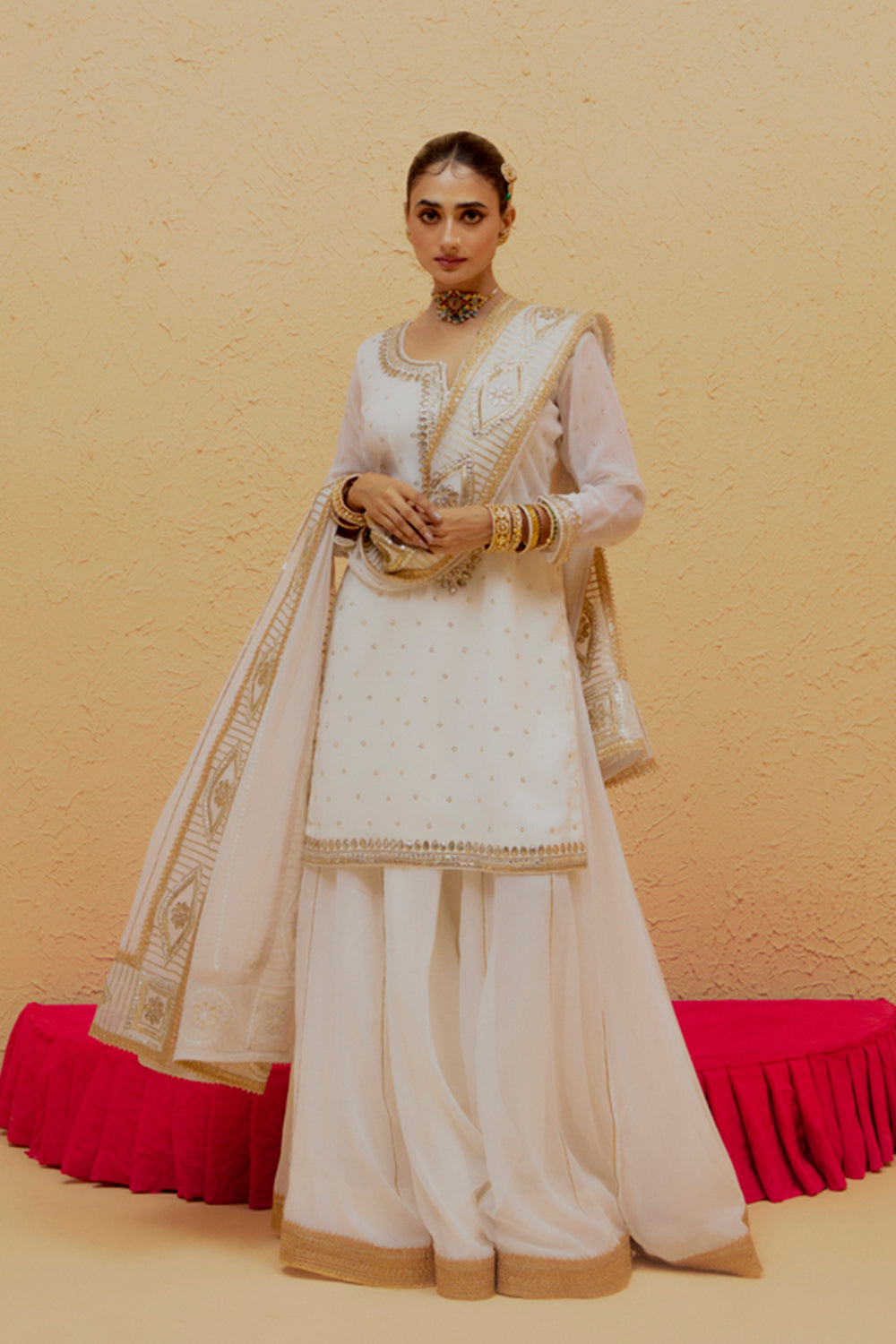 Short georgette kurta with gota patti detailings on the necklines hem and cuffs. paired with a gorgeous hand embroidred gota and mixed medium duptta and a gherdar lengha.