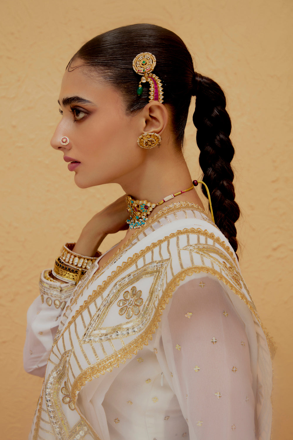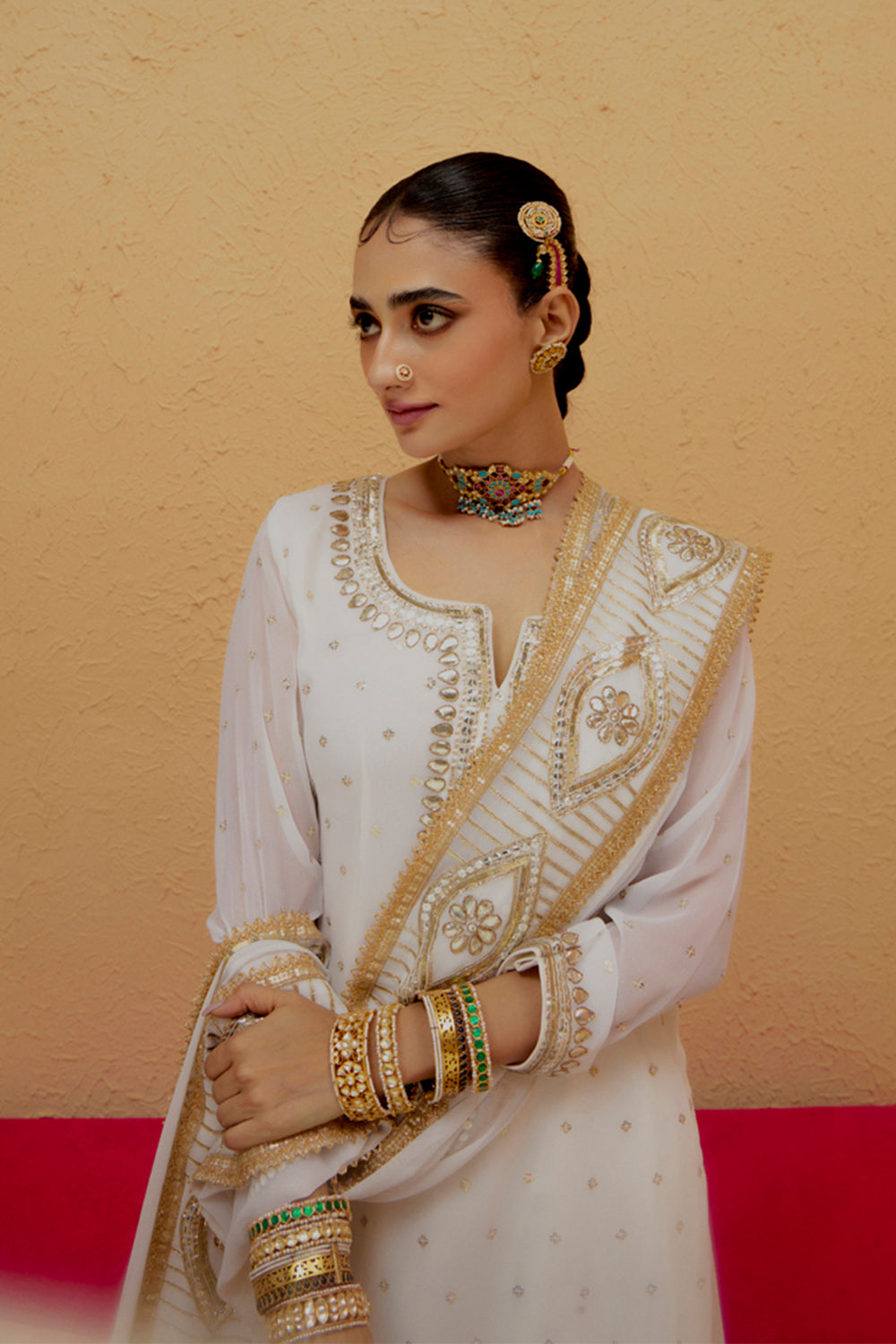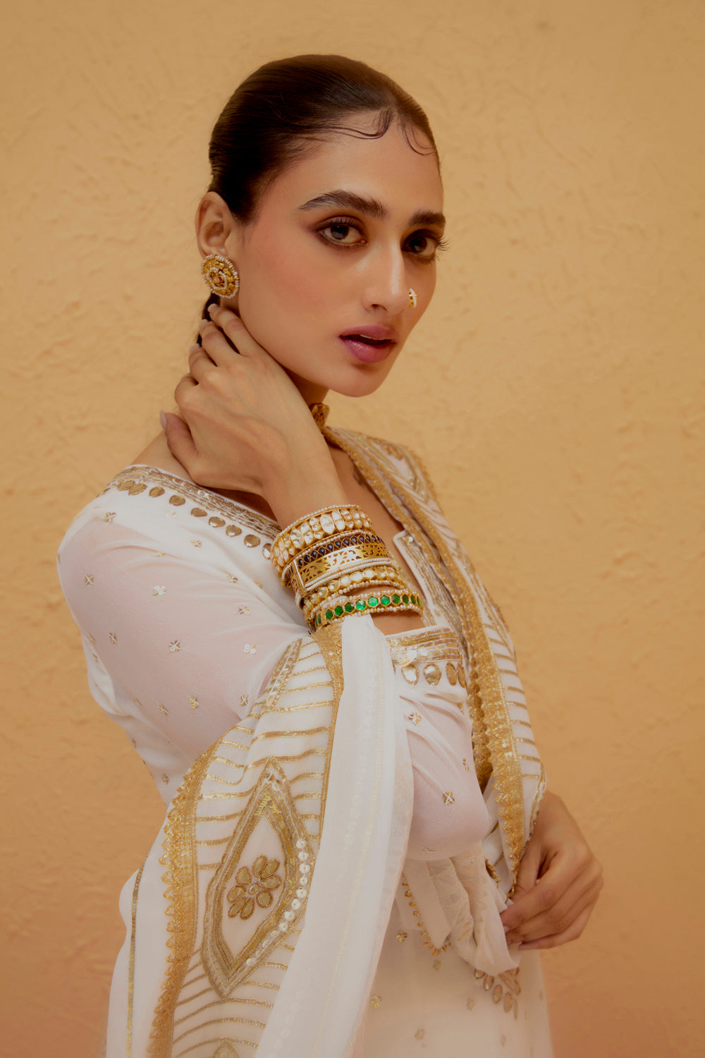 Short georgette kurta with gota patti detailings on the necklines hem and cuffs. paired with a gorgeous hand embroidred gota and mixed medium duptta and a gherdar lengha.