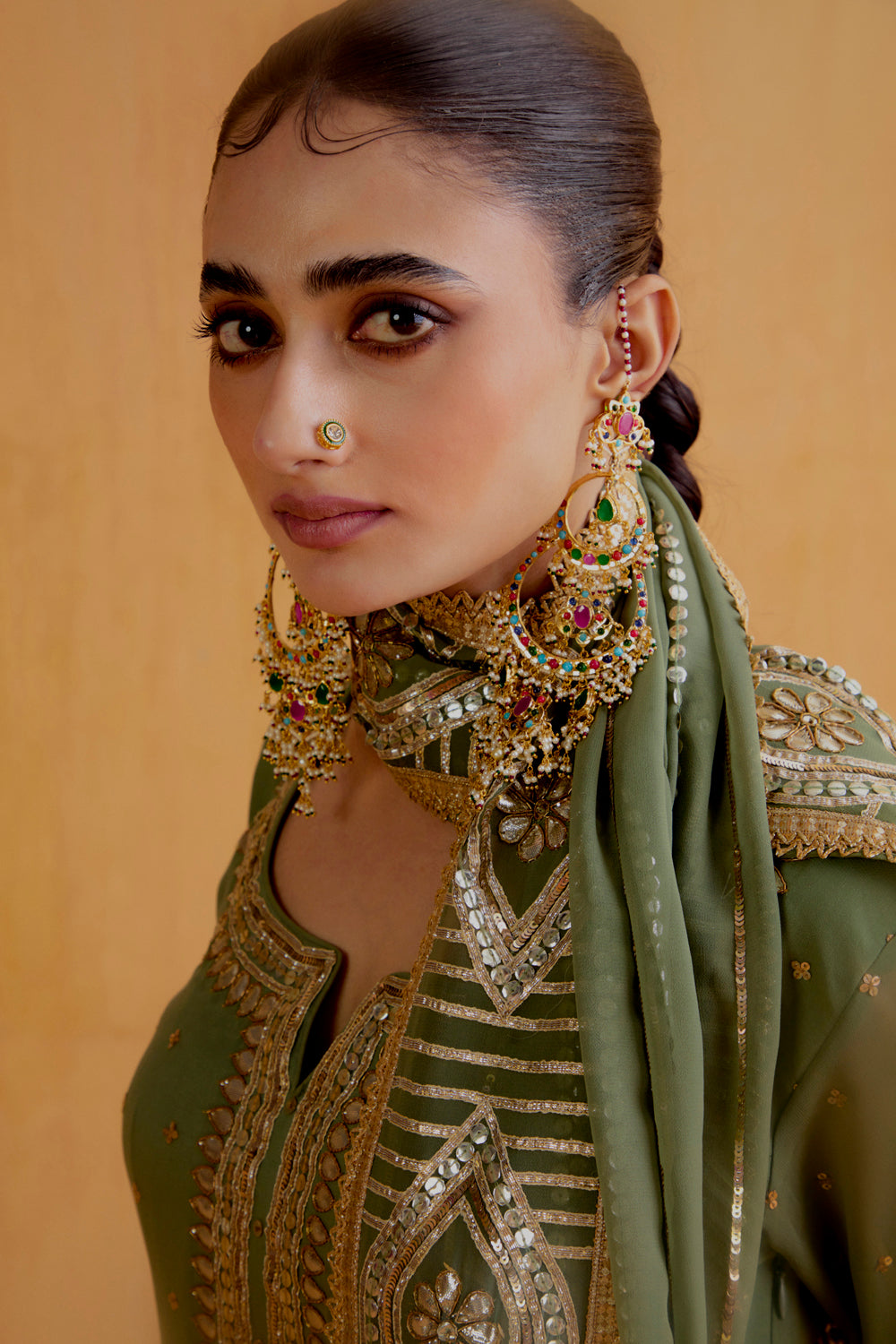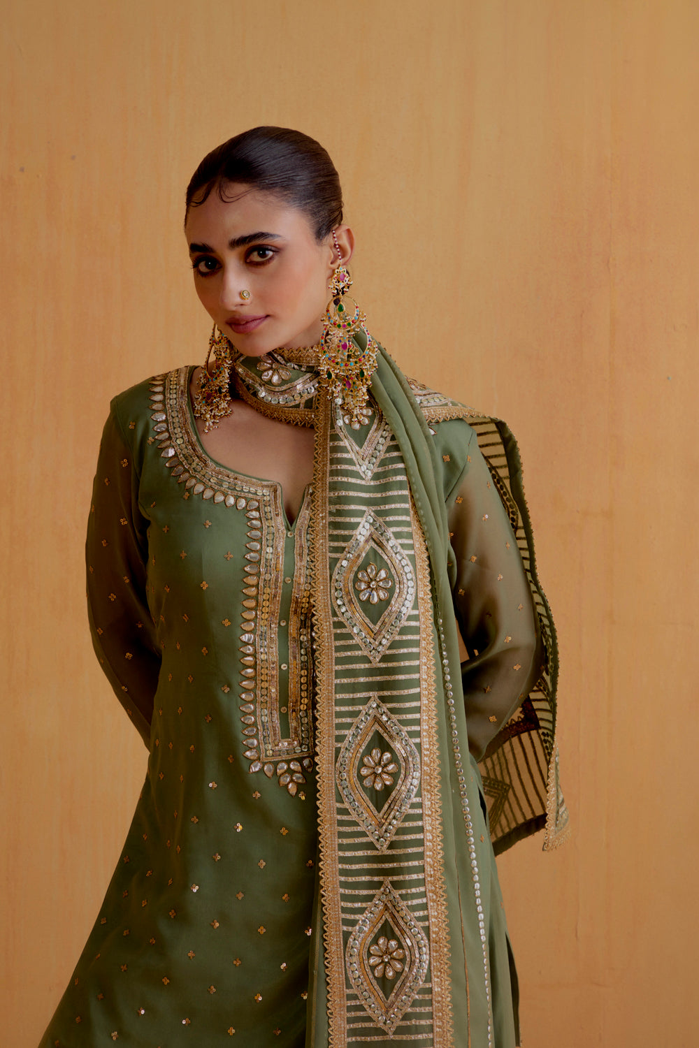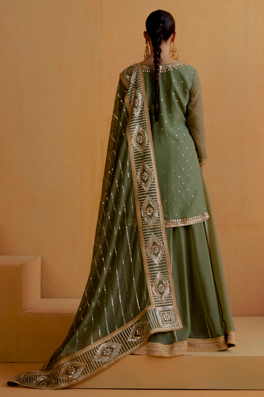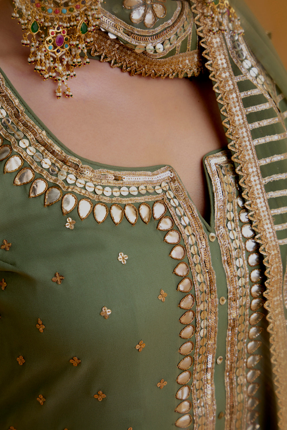 Short georgette kurta with gota patti detailings on the necklines hem and cuffs. paired with a gorgeous hand embroidred gota and mixed medium duptta and a gherdar lengha.