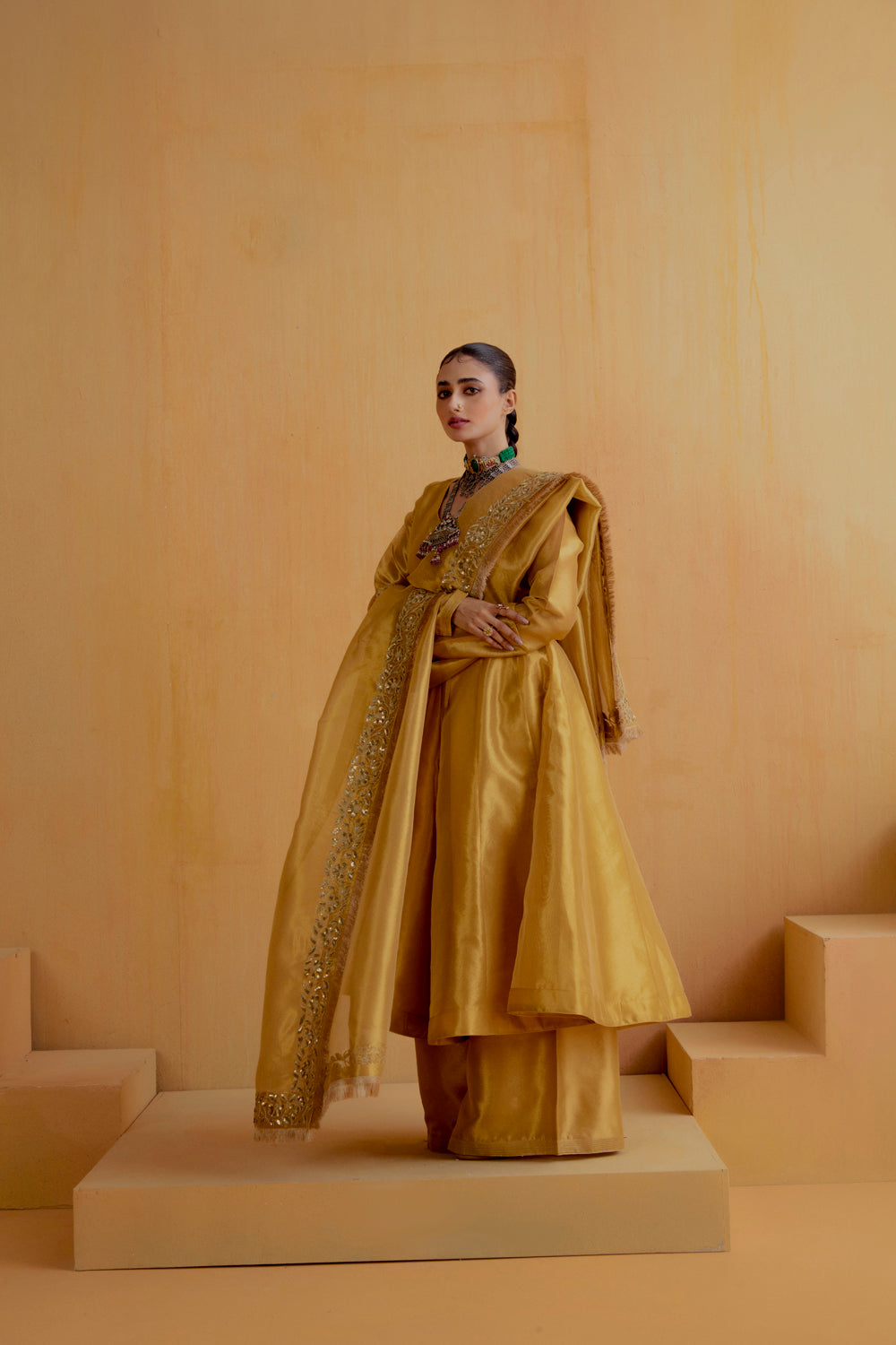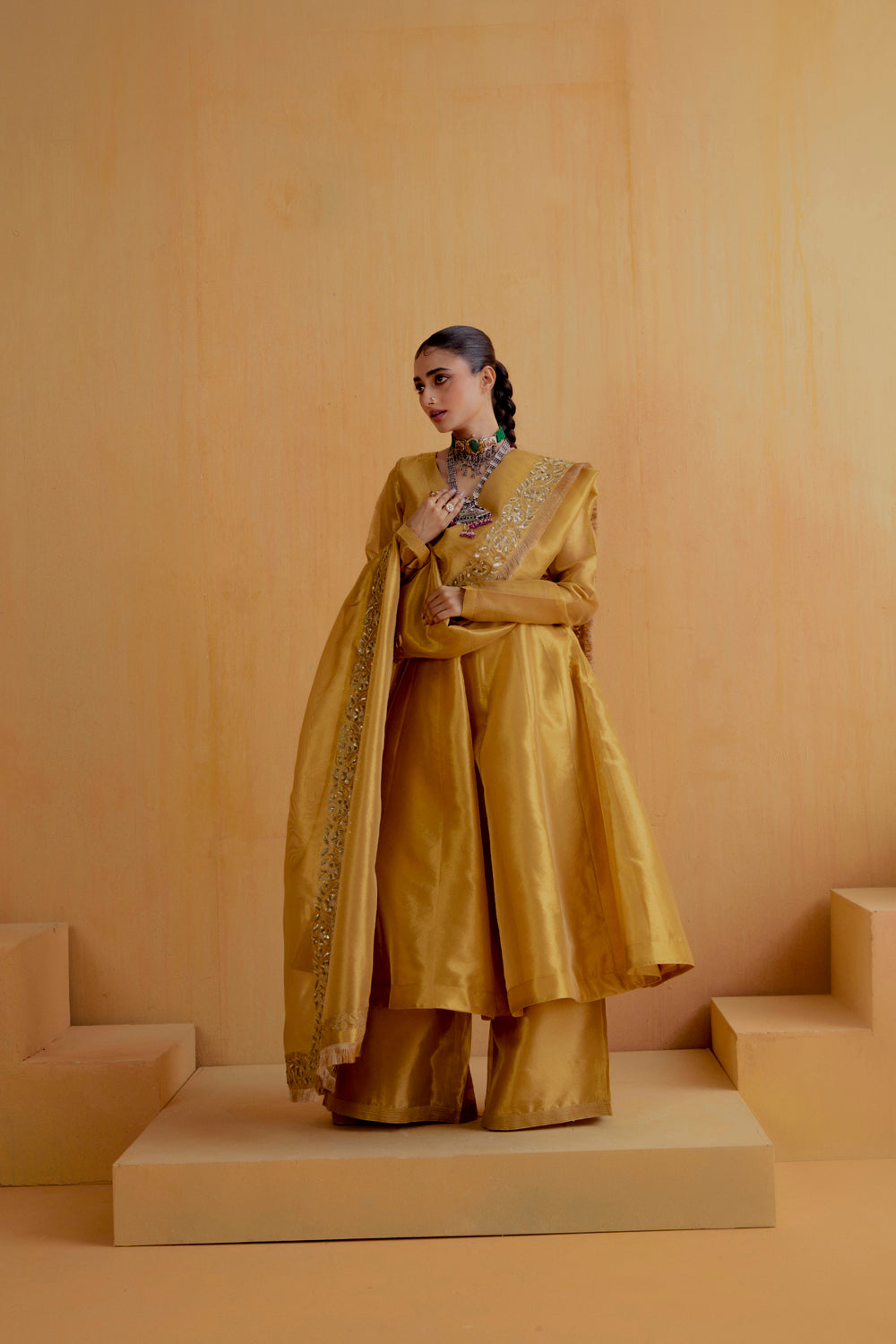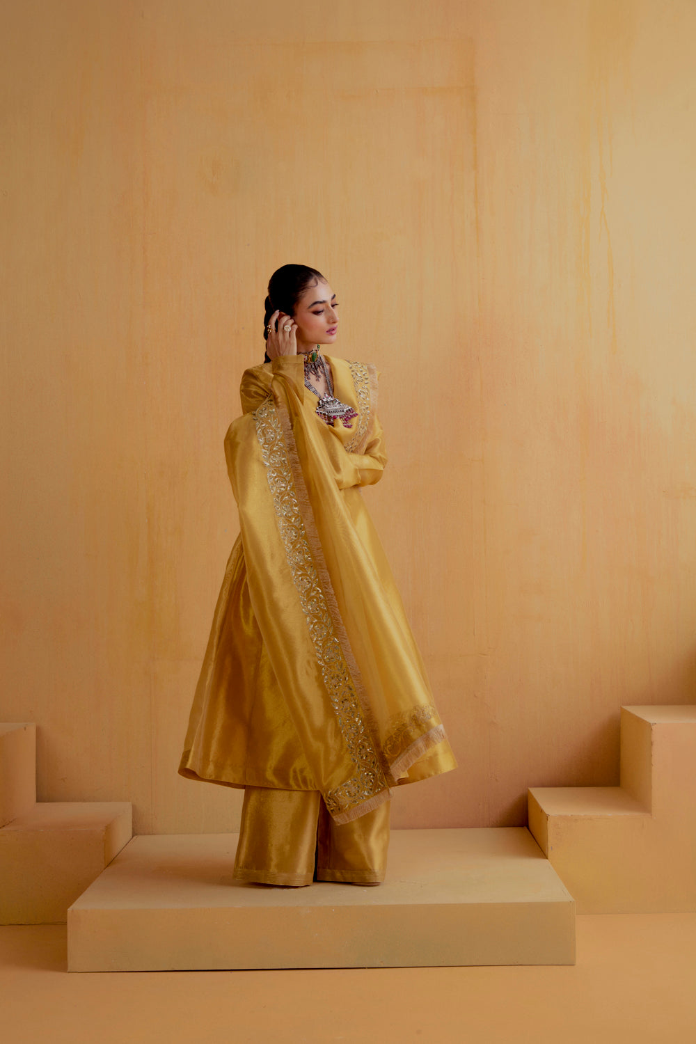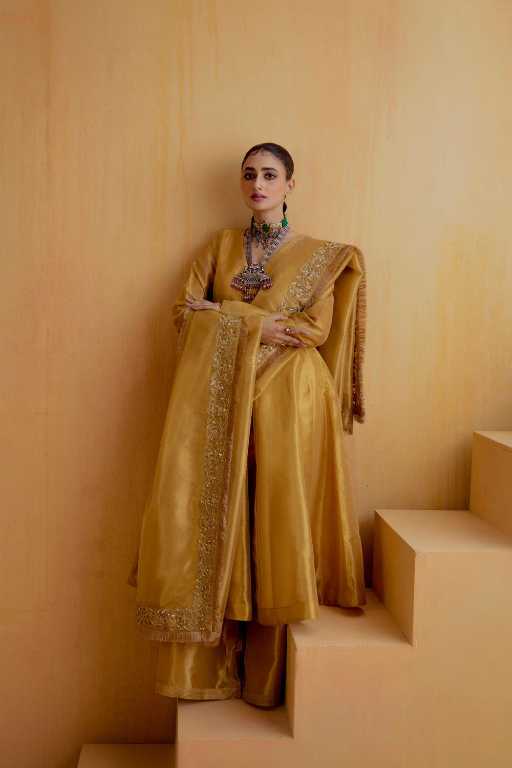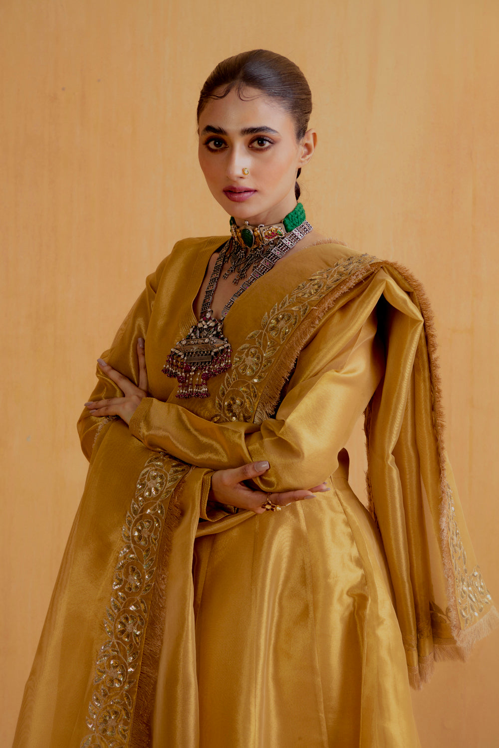 Antique gold tissue kalidar with big flare farshi. it is paired with a delicate mixed medium zardosi embroidred dupatta.