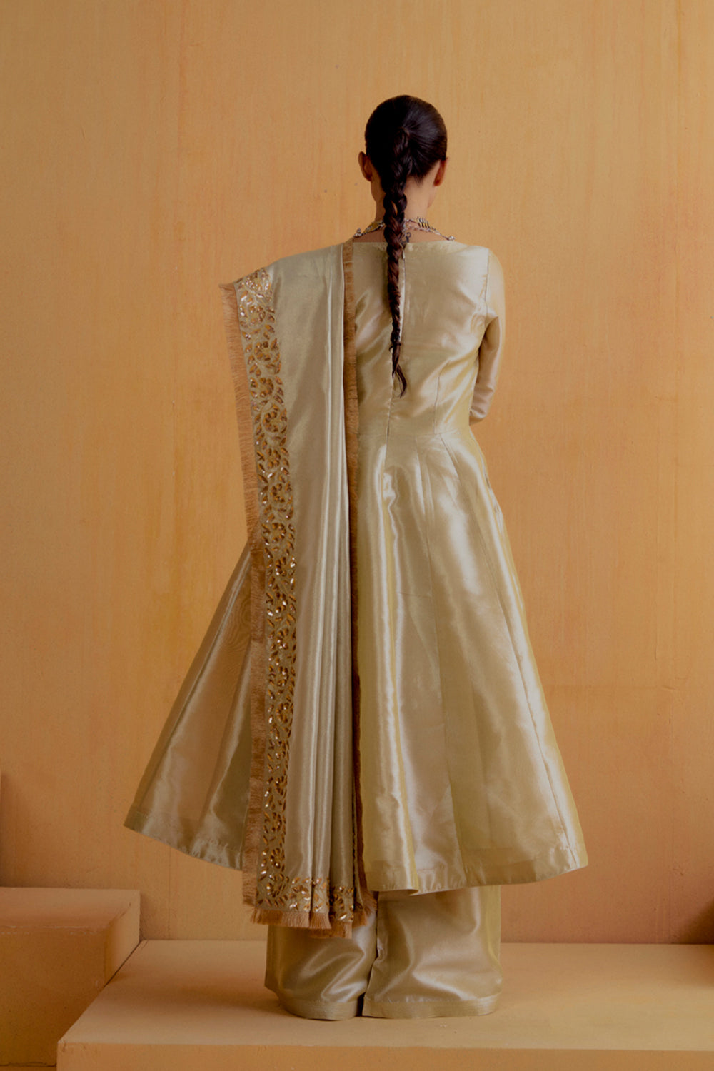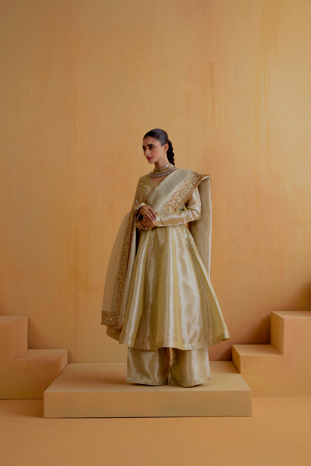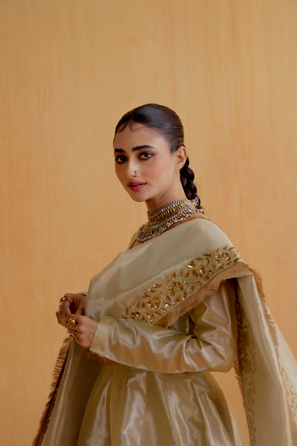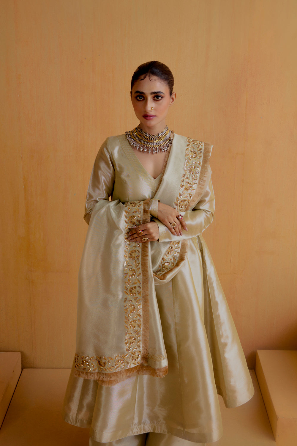 Antique silver (champagne) tissue kalidar with big flare farshi. it is paired with a delicate mixed medium zardosi embroidred dupatta.
