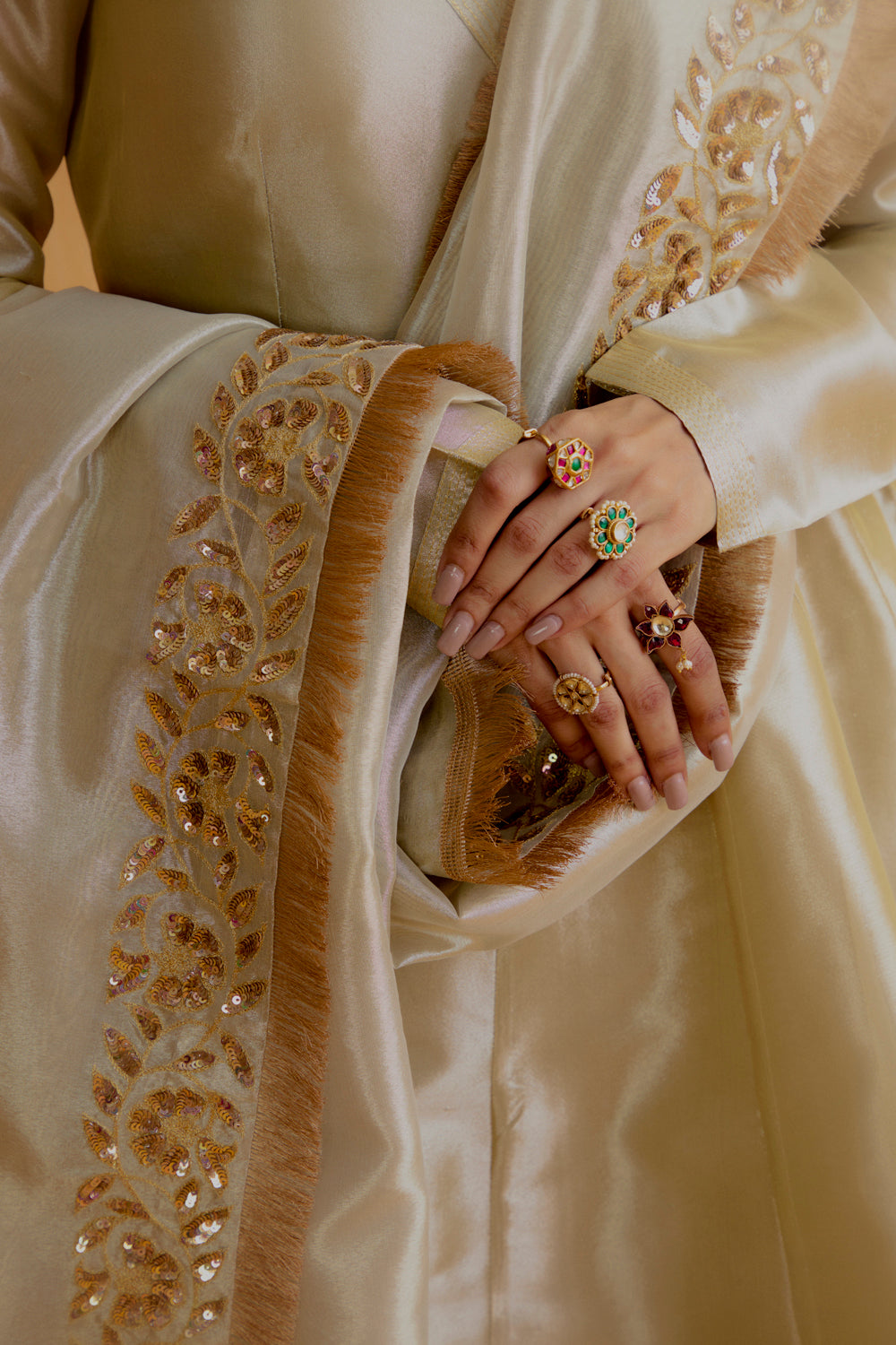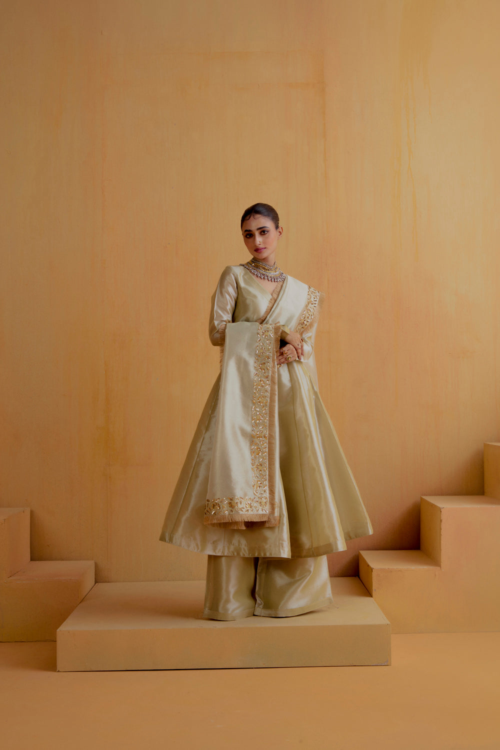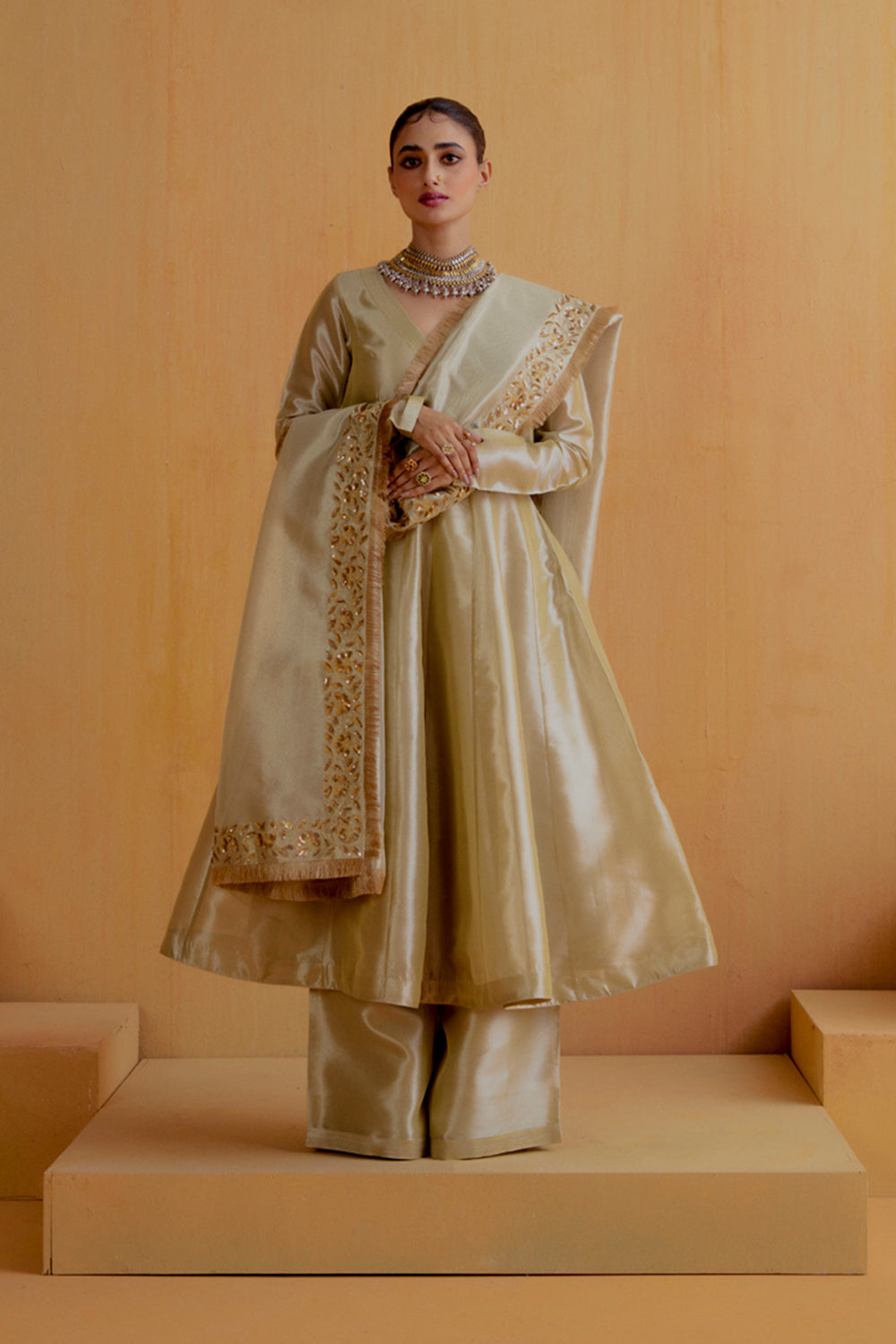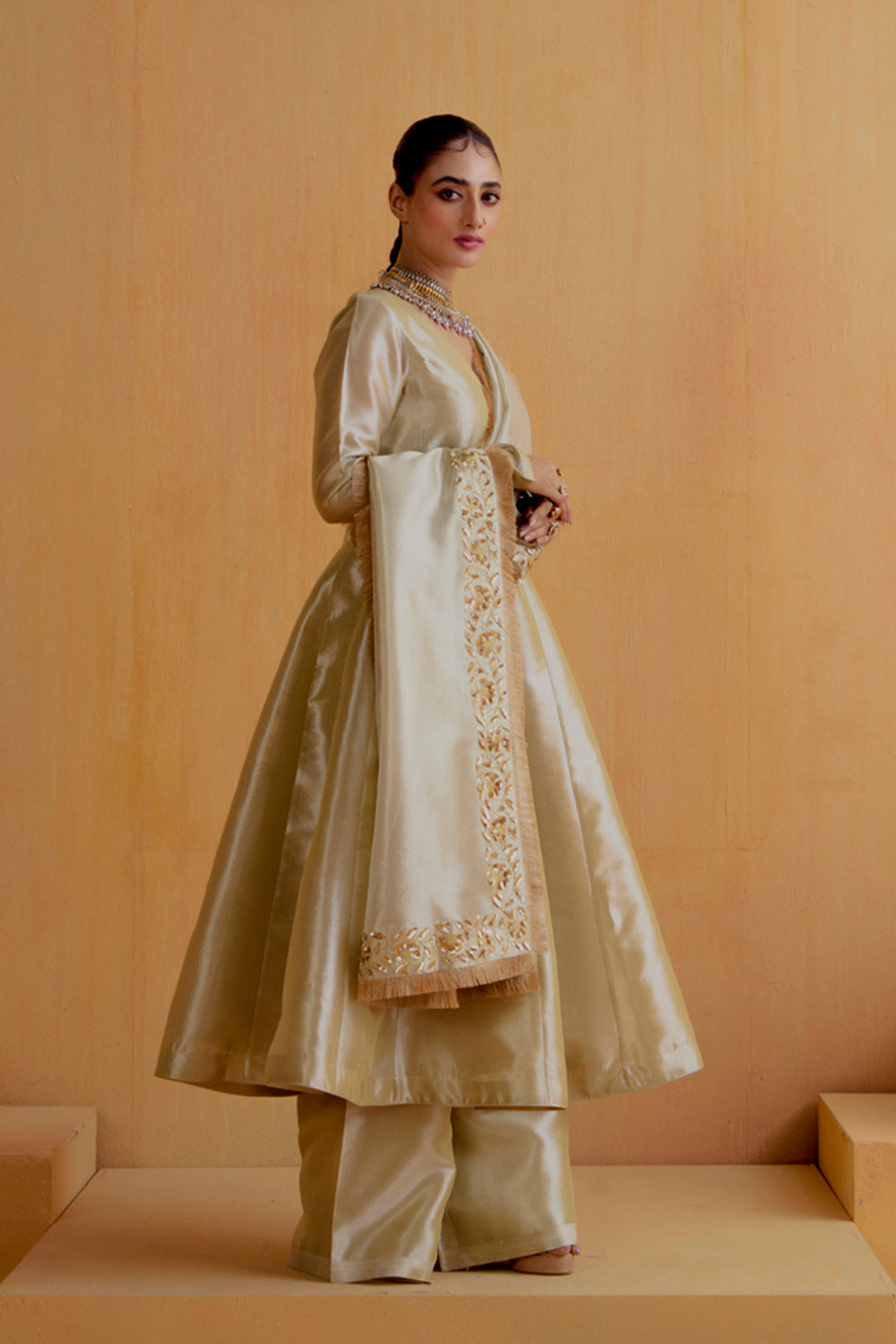 Antique silver (champagne) tissue kalidar with big flare farshi. it is paired with a delicate mixed medium zardosi embroidred dupatta.