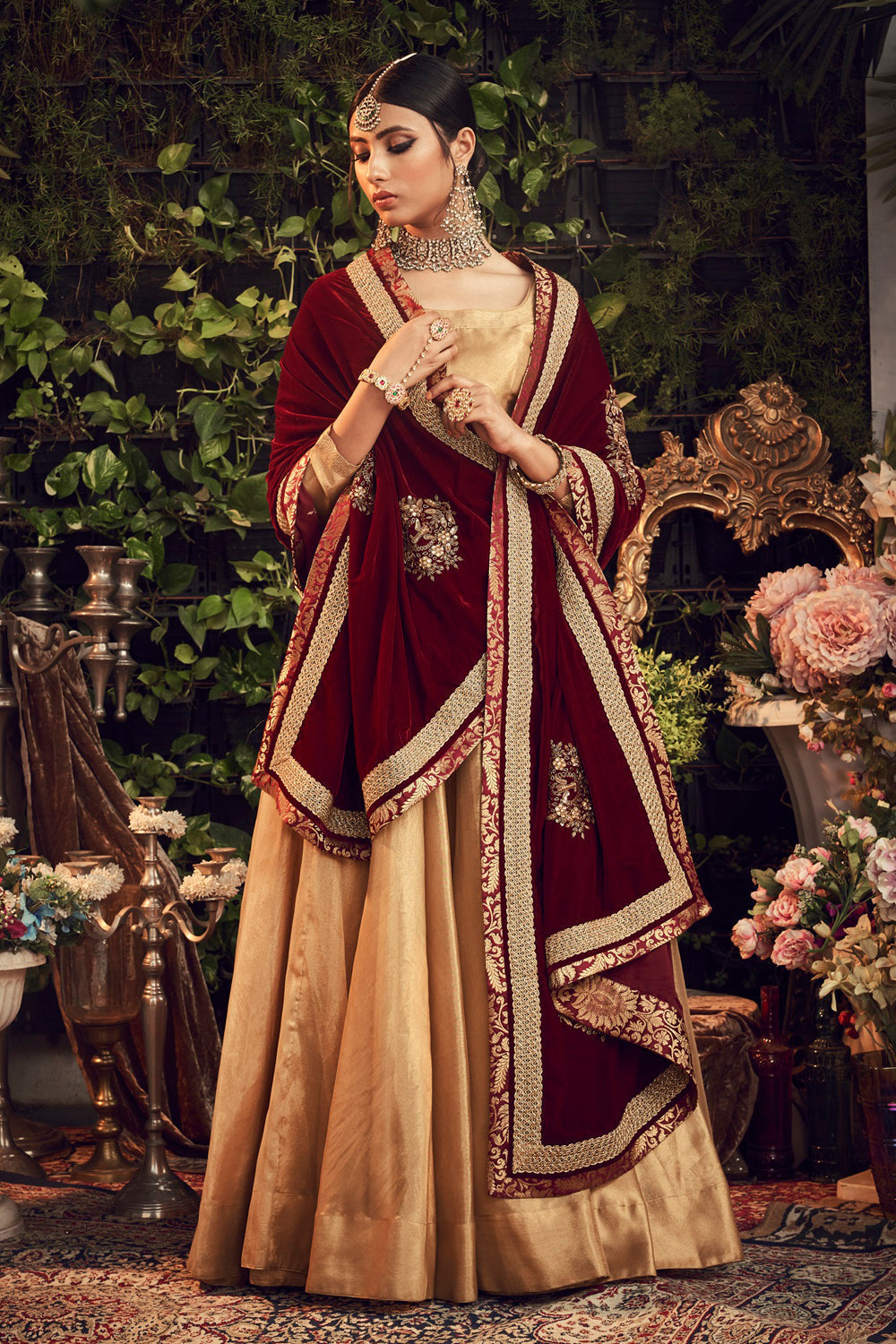 Oxidised gold silk tissue lengha set teamed with rosewood mahroon silk velvet dupatta shawl adorned with inticate zardosi botas all over