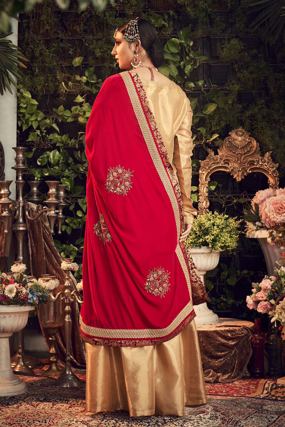 Oxidised gold silk tissue lengha set teamed with crimson wine silk velvet dupatta shawl adorned with inticate zardosi botas all over