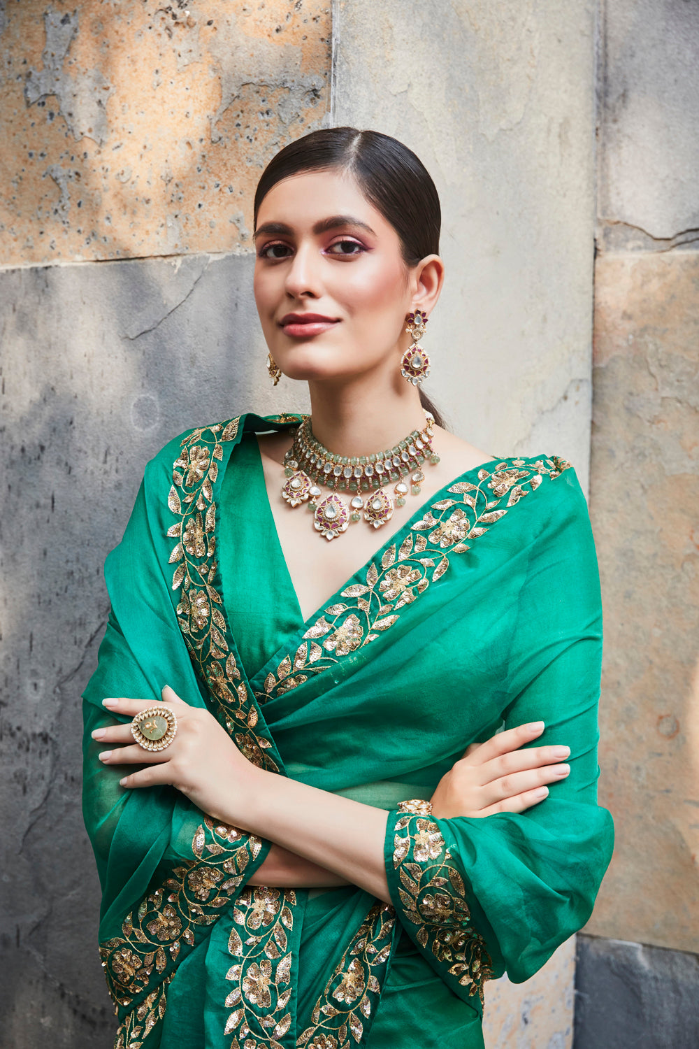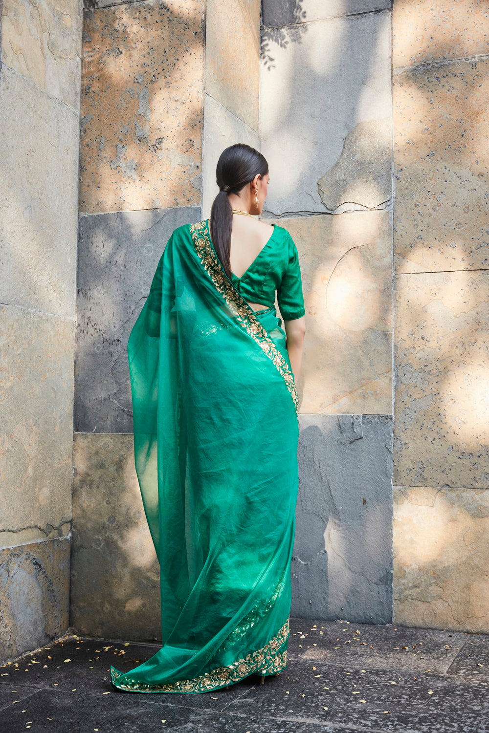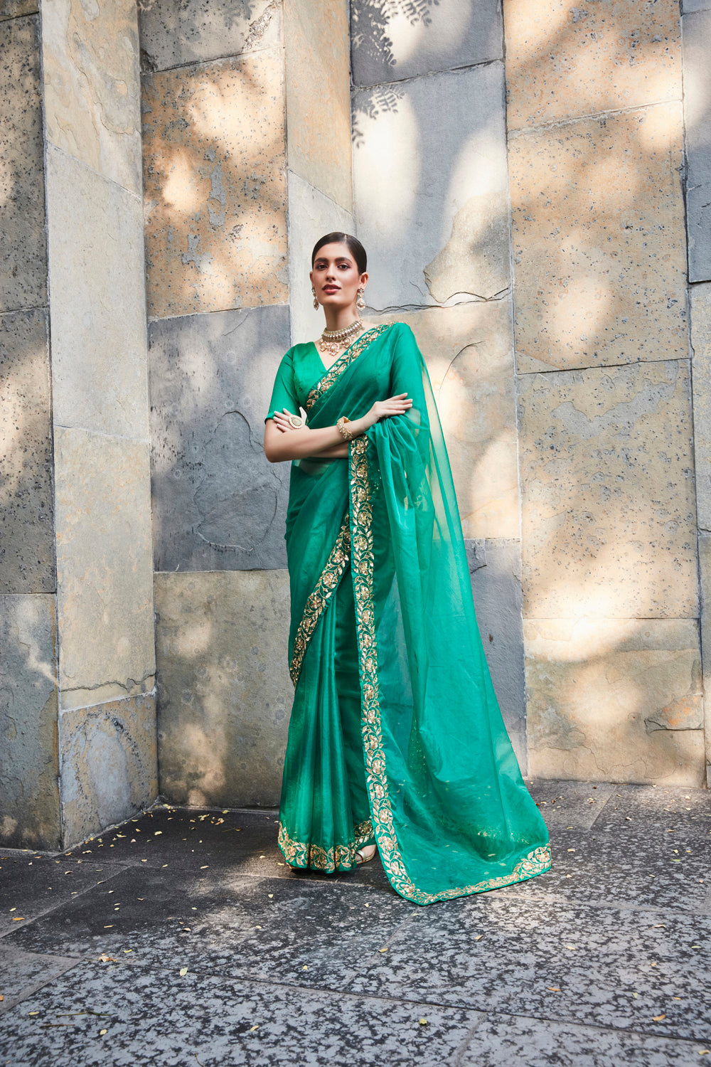 Green silk organza saree with delicate floral pattern border in 3d sequence and zari. teamed up with a plain satin silk blouse.