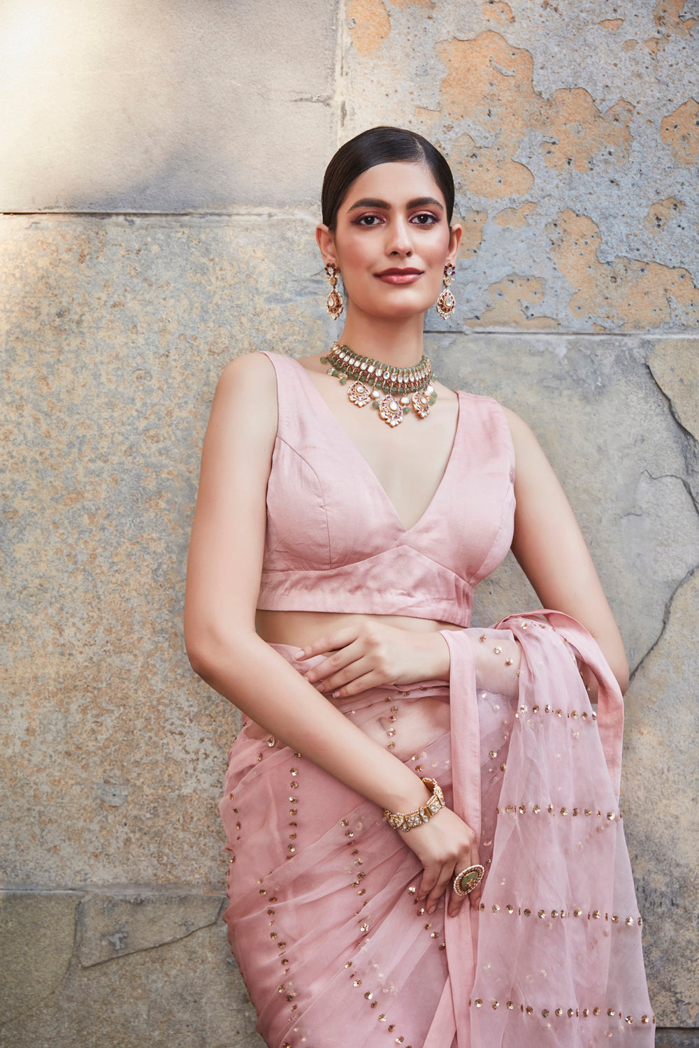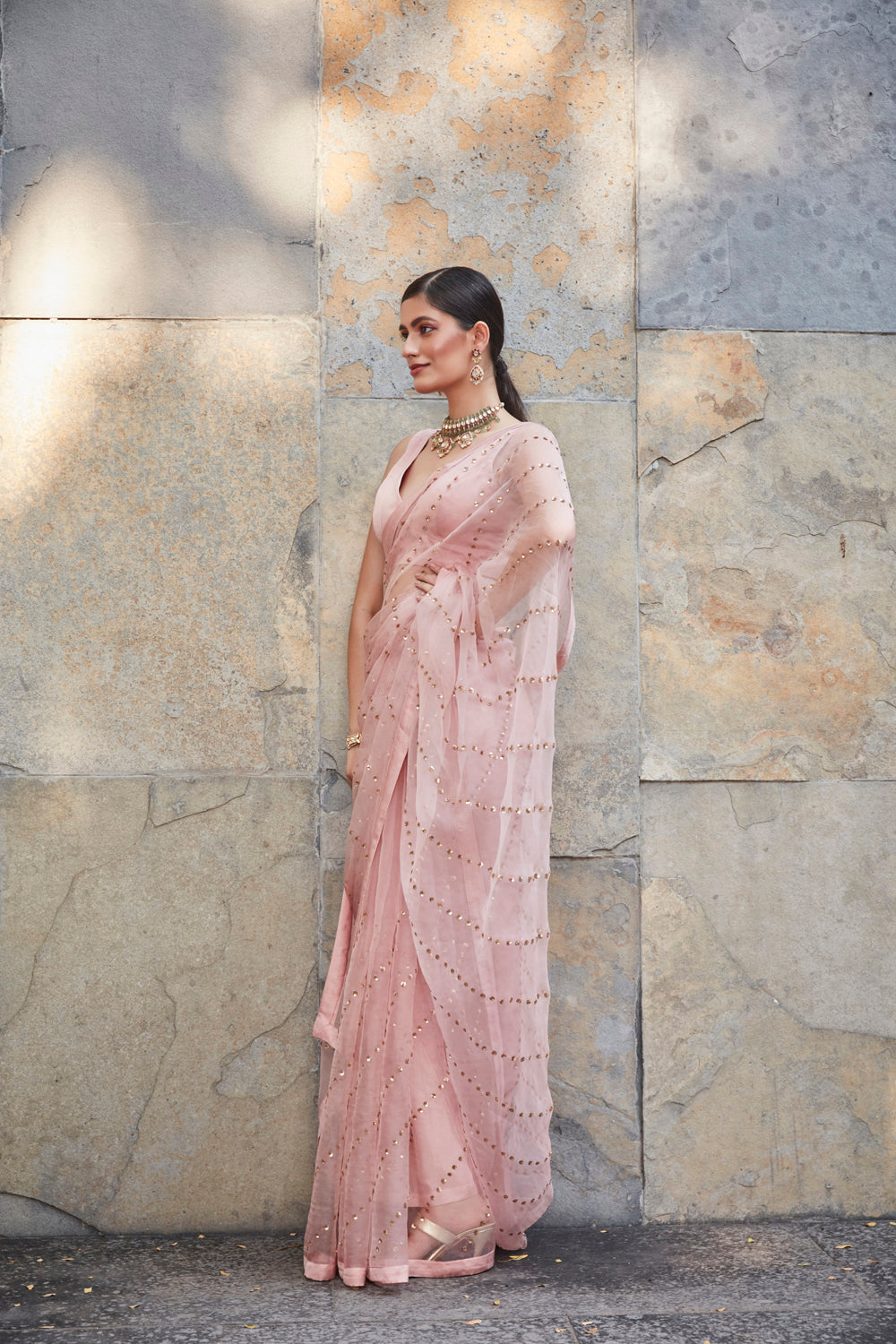 Blush pink silk organza saree with delicate 3d sequence detailing all over. teamed up with a plain satin silk blouse.